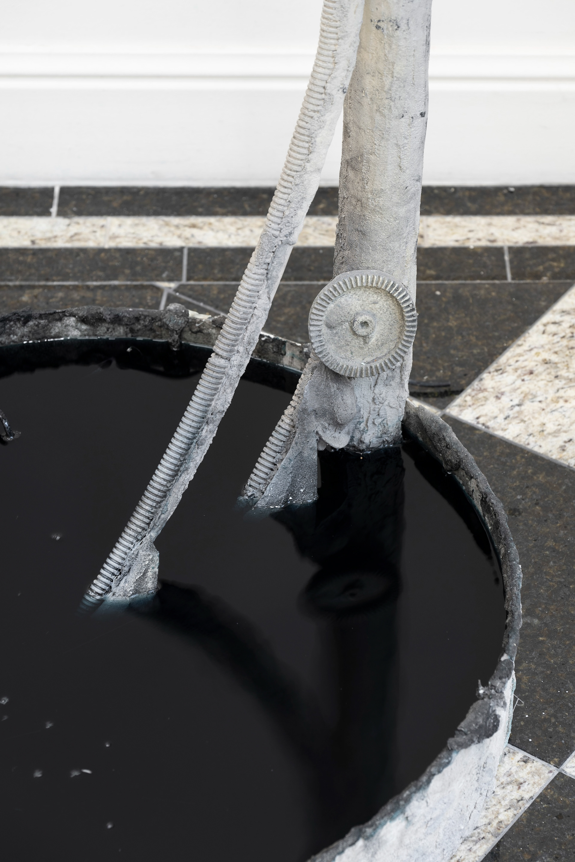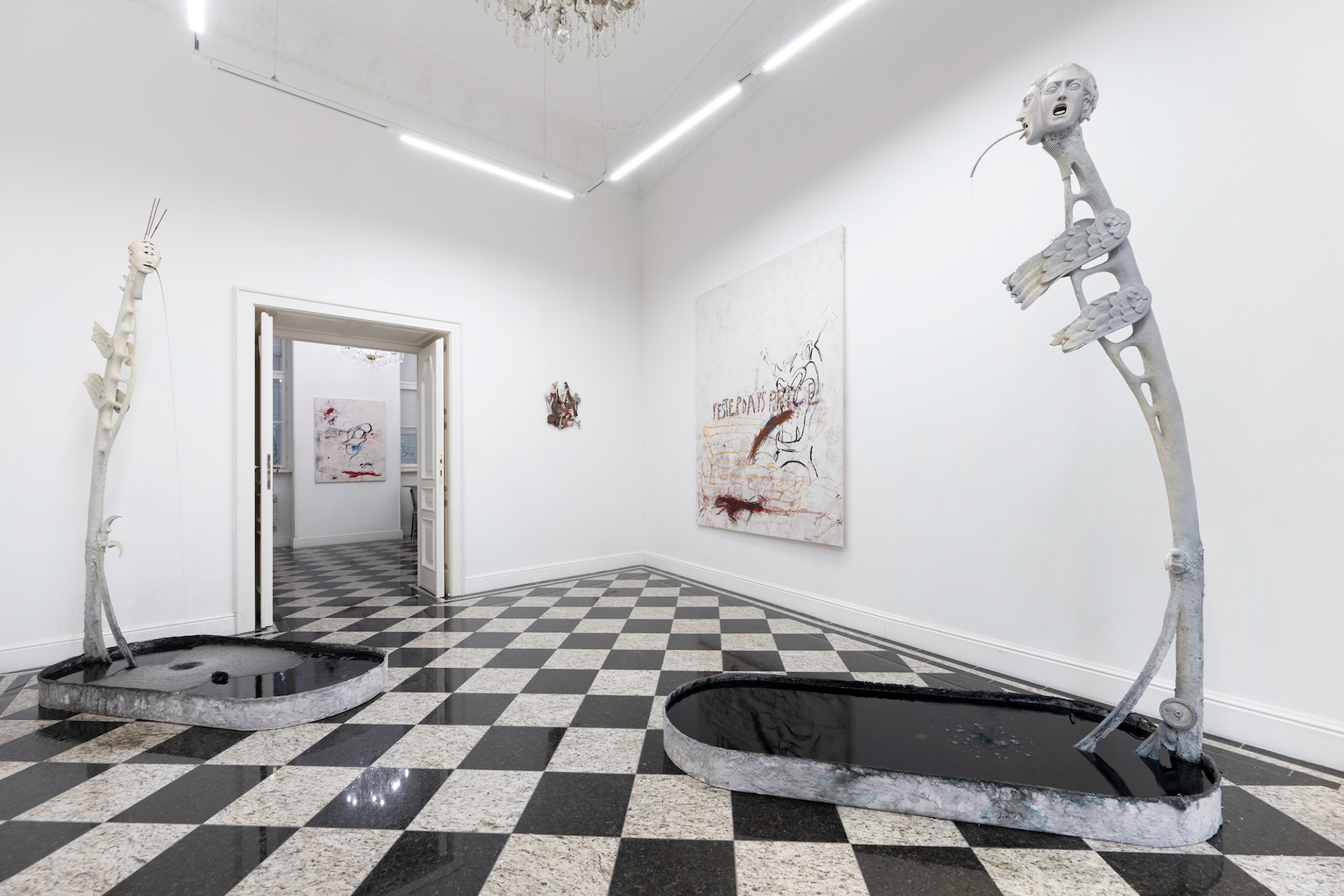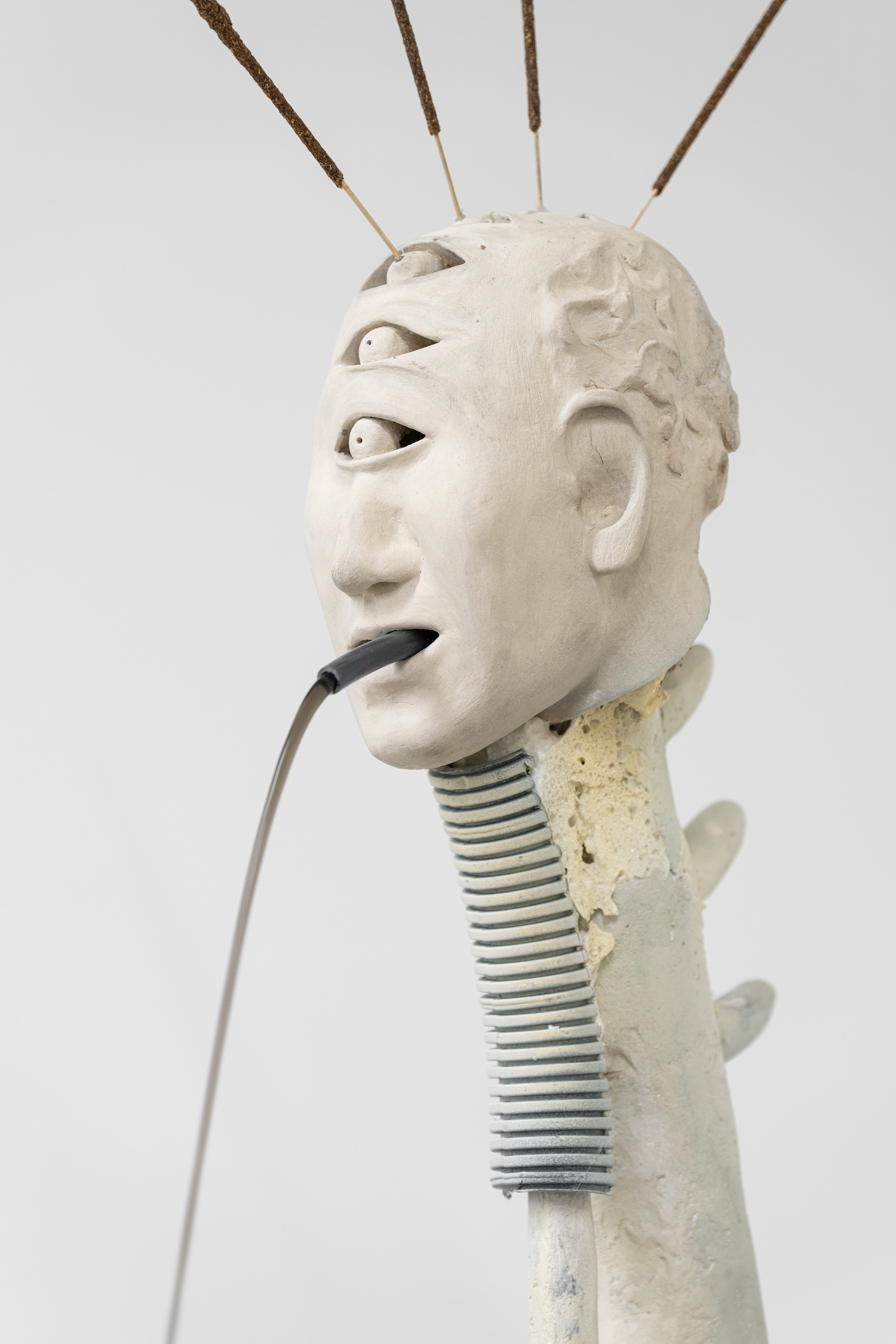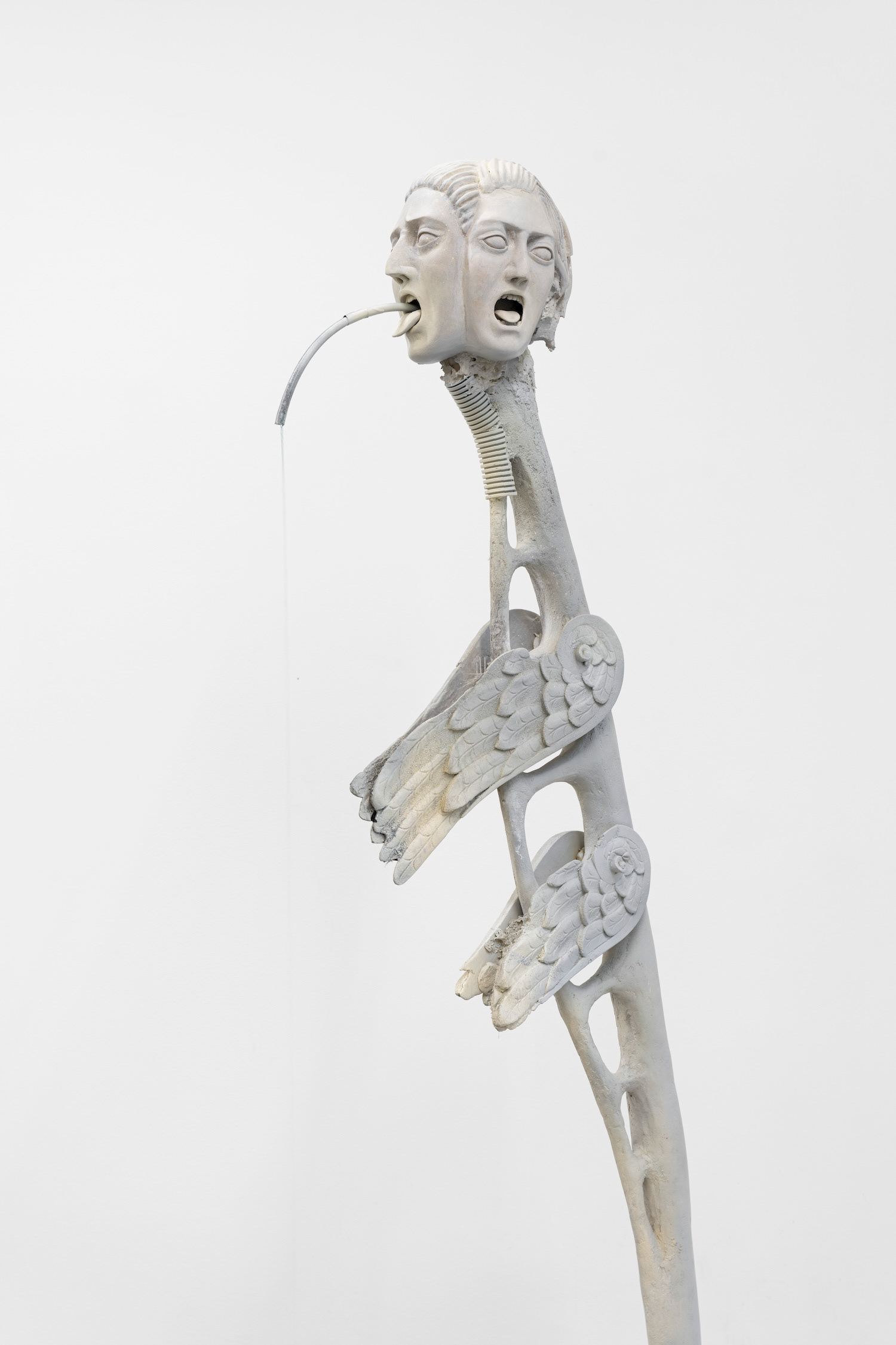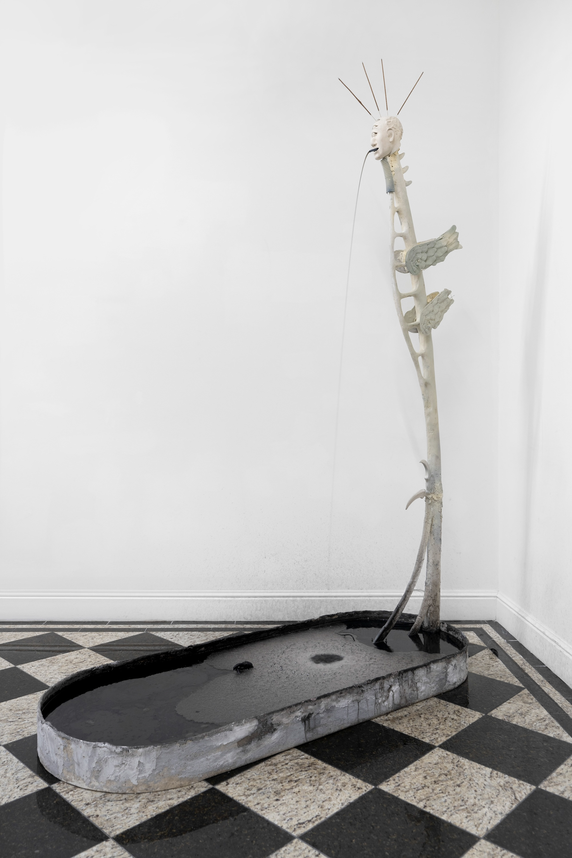 The works by Céline Struger (b. 1982, Klagenfurt; currently based in Vienna) are based on traditional sculpture, which she updates through found materials or technical elements. They appear as mix of dystopian residues of past cultures, combining historical pre-images fused in personal mythologies and captivating fictions into new contexts. Two sculptures - hybrids of grotesque gargoyles and fountains where we discover fragments of different cultures or religions – dominate the exhibition. Struger creates odd figures combining a three-headed version of the god Janus, symbolising the past, present and future, with her own vision of Cyclops with multiple eyes, transforming his originally restricted view into the ability to perceive reality from multiple perspectives. Original mythological (anti)heroes emerge through a complementing pair of wings or claws of Harpy, changing knowledge and testing the boundaries of fantasy, myth or (pseudo)spirituality.