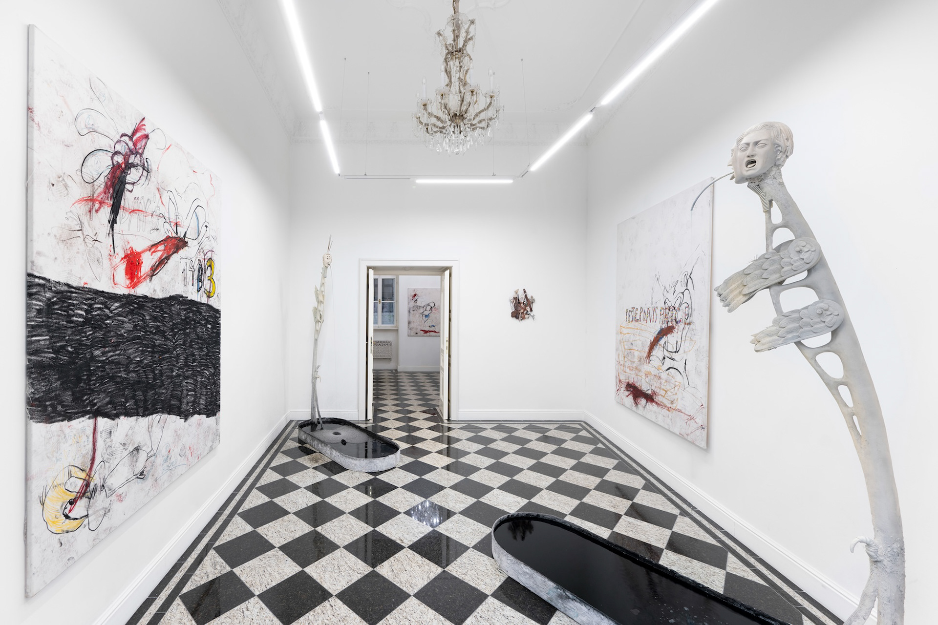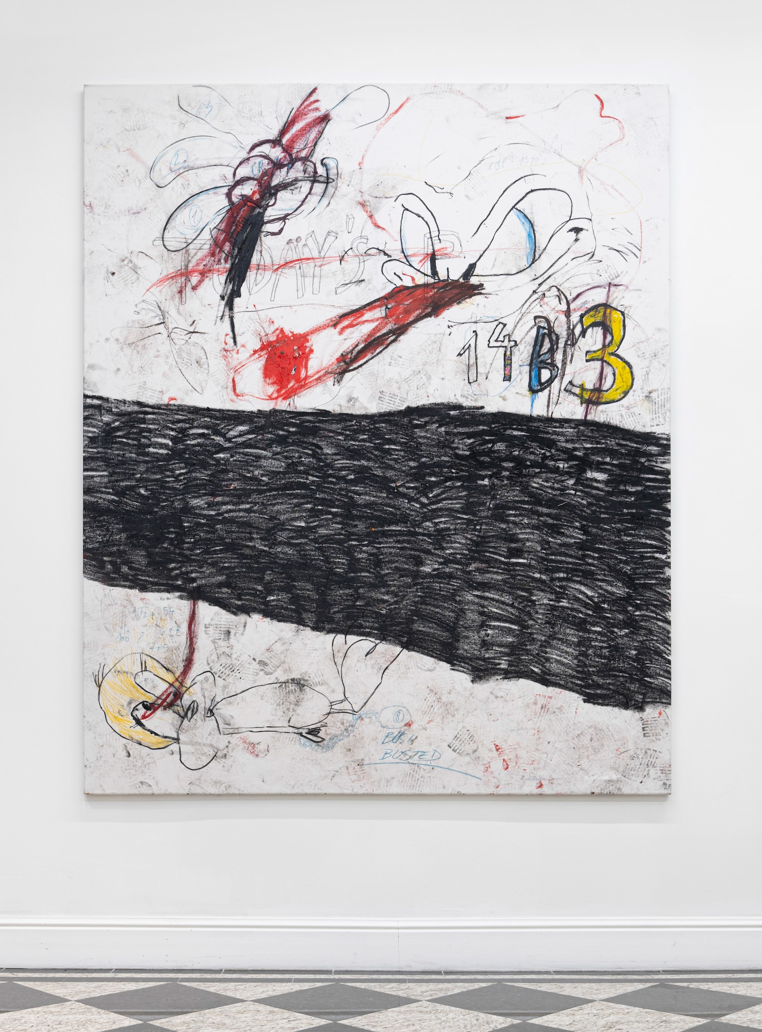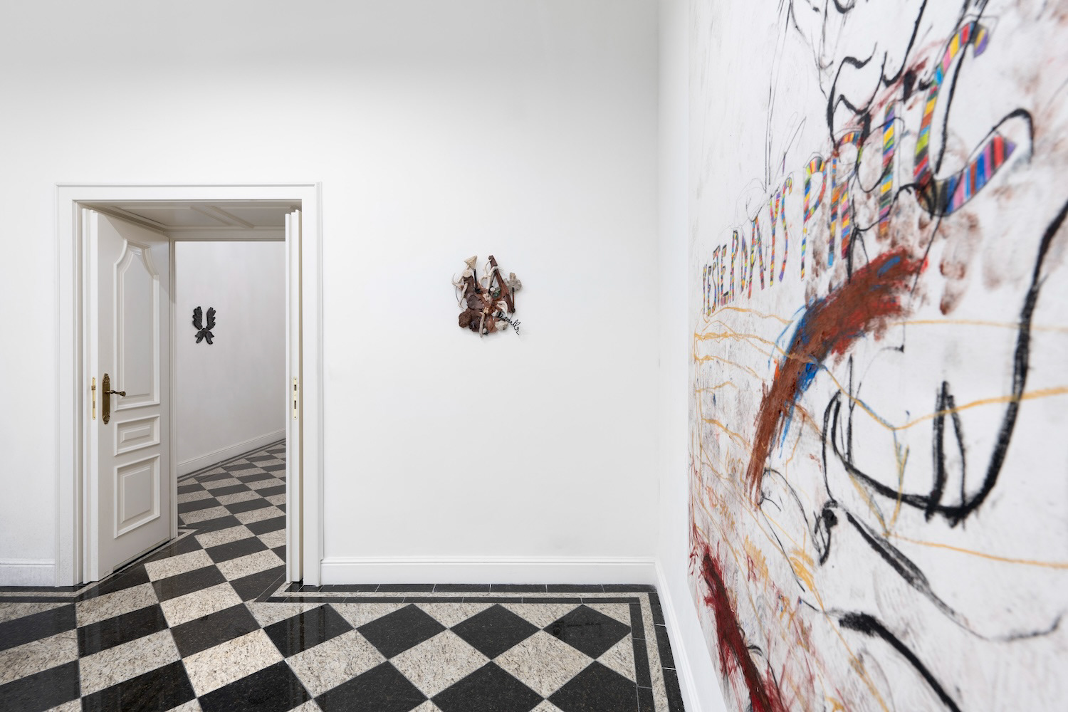 Large-format paintings by Ester Parasková (b. 1993, Kuřim; currently based in Prague) preserve expressive drawing records in between fluid automatism and elaborate reflections on the contemporary world. Their raw naturalism and nude visuality is striking at first glance. Traces of dirty shoes, motion, quick scribbles and shaky handwriting are accompanied by appropriations of familiar cartoon characters or text slogans. Her visual collages oscillate between conflict and charm, good and evil, beauty and ugliness, irony and weightiness. Parasková anchors the imaginary bedlam through functional composition, contrast and colour combinations, elevating it through critical view of the society, violence, consumerism or the functioning of the world of art.