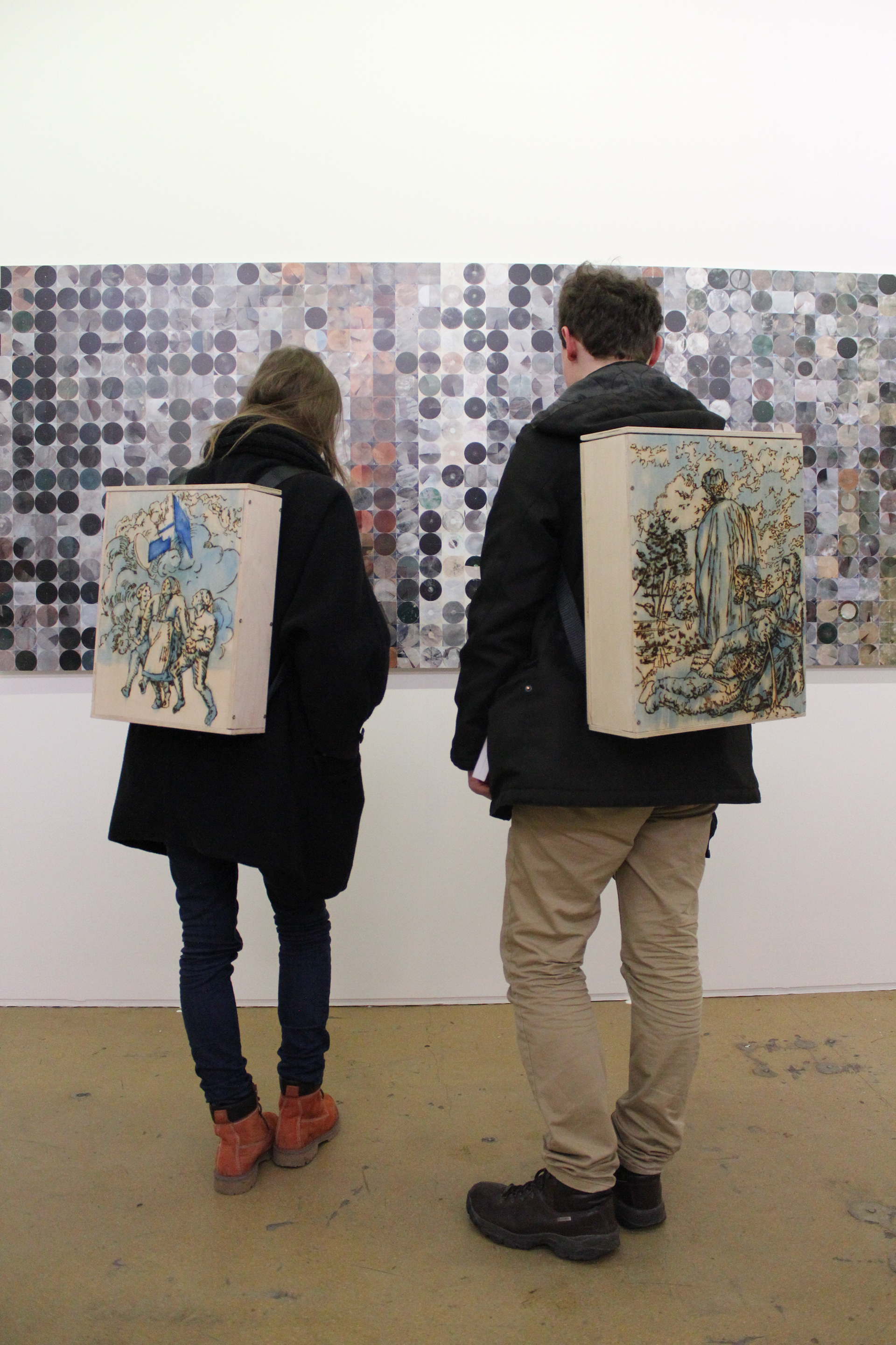 Skôr išlo o akési skúšanie pravidiel veľtrhu. S obrazom v ruke by ťa tam pravdepodobne nepustili, keď však máš tu istú vec na chrbte v podobe dreveného ruksaku, považujú ťa skôr za nejakého výstredného človeka, ktorý si potrpí na nezvyčajné módne doplnky. Keďže v Holandsku sme boli v pozícii umeleckých rezidentov, takých novodobých vandrovných remeselníkov, brali sme tie ruksaky trochu aj ako odkaz na slovenských drotárov a ich typické krošne, v ktorých si nosili náradie. Ďalší faktor je, že za kóje na veľtrhoch galérie platia tisíce eur a my sme si mohli dovoliť doniesť ukázať podobne veľké veci, aké sa tam vystavovali, ale bez platenia prenájmu. Niektorí nás tam možno brali ako parazitov, ale veľa ľudí ten vtip pochopilo, fotili si nás, debatovali sme o tom atď. Napísal o nás aj jeden holandský blog o umení, ale inak na to zatiaľ nemáme žiadne extra odozvy.