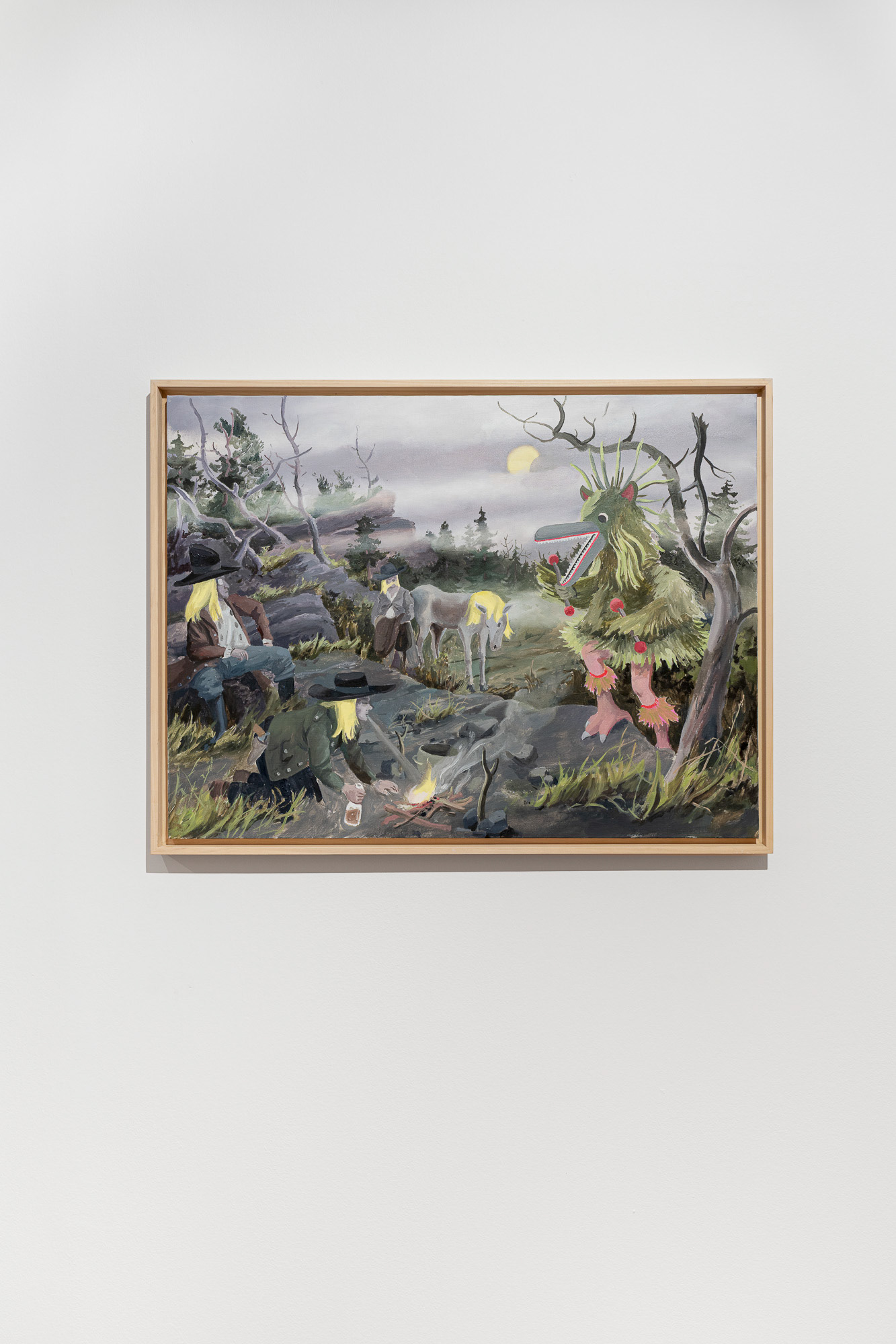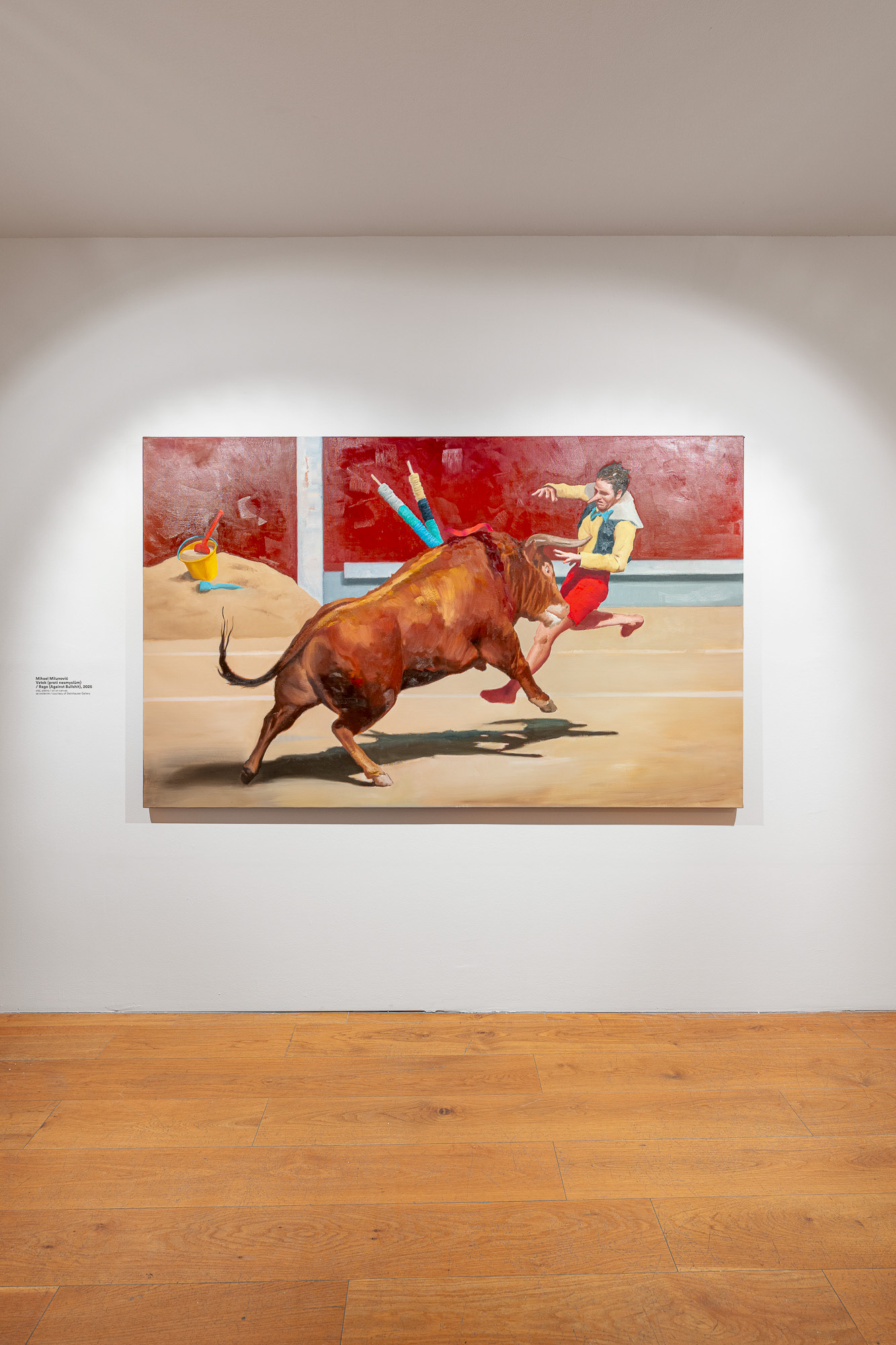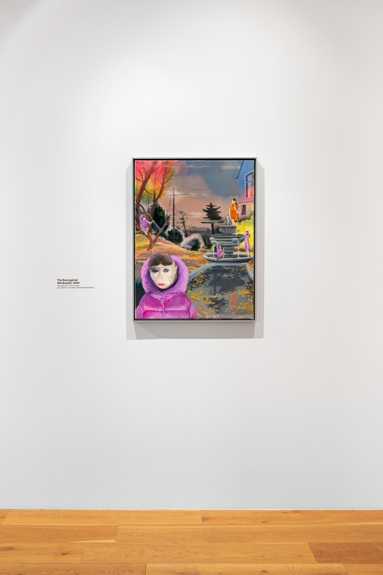 Themes of masks and costumes serve as vessels of meaning in both artists’ paintings, engaging with symbolism, representation, and associated identity. In Milunović’s work, uniform-like garments echo formal or ideologically coded attire. This is often reinforced by the recurring presence of faceless figures, heightening a sense of anonymity, or a staged, ritualistic act. Baumgärtel’s characters appear civilian, and thereby offering potential triggers for personal introspection. In some works, figures appear in animal masks or carnival costumes, lending the works an absurdist flair, whilst also unveiling emotional and human dimension of the characters.