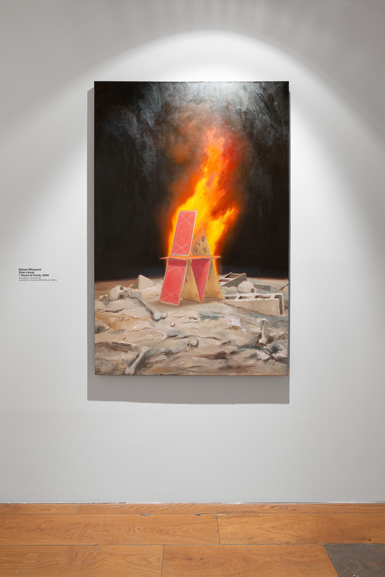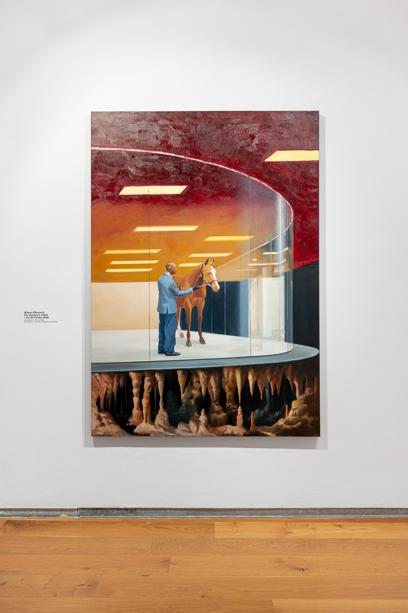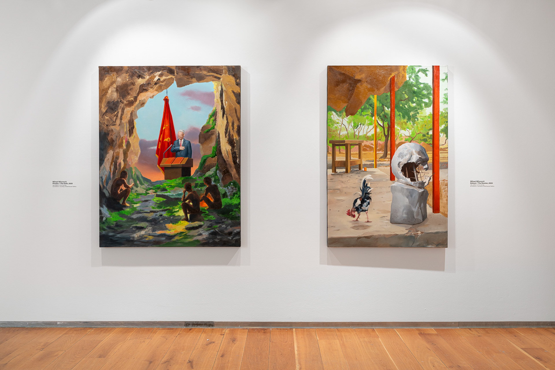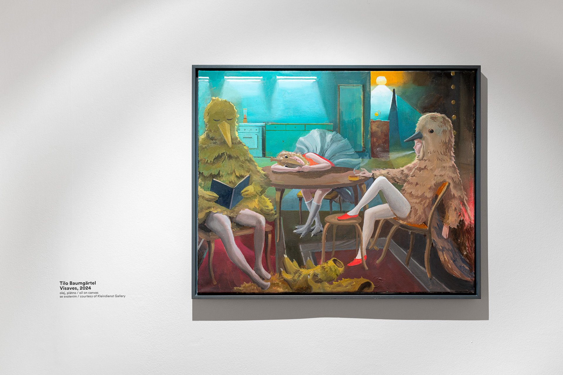 The joint exhibition brings together two artists of the same generation: Tilo Baumgärtel (b. 1972), based in Leipzig, and Mihael Milunović (b. 1967), who works and lives in between Paris and Belgrade. Each unfolds a distinct artistic universe, rich in layered visual narratives and shaped by singular dramaturgical strategies, set within a realm of a distorted reality. Both artists probe the human relationship to reality with nuance and sensitivity, subtly playing with the mechanics of depiction and the nature of perception. Beneath the surface of seemingly familiar scenes, they weave in subversive codes—echoes of psychological, social, political, historical, and imagined realities. Their works reveal a porous boundary through which memory, fiction, and the subconscious freely seep. Rather than depicting the world as it is, they bring to the fore irrationality, symbolism, and psychological events—often concealed beneath the surface of the everyday. Realism merges organically with the principles of surrealism, together revealing the tensions between power, vulnerability, and human estrangement.