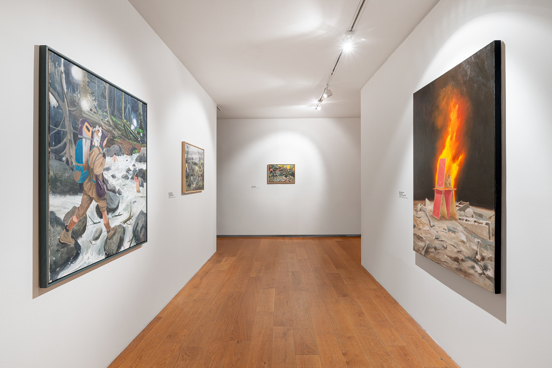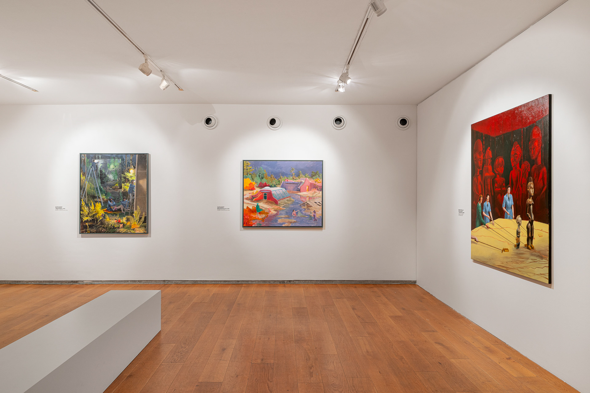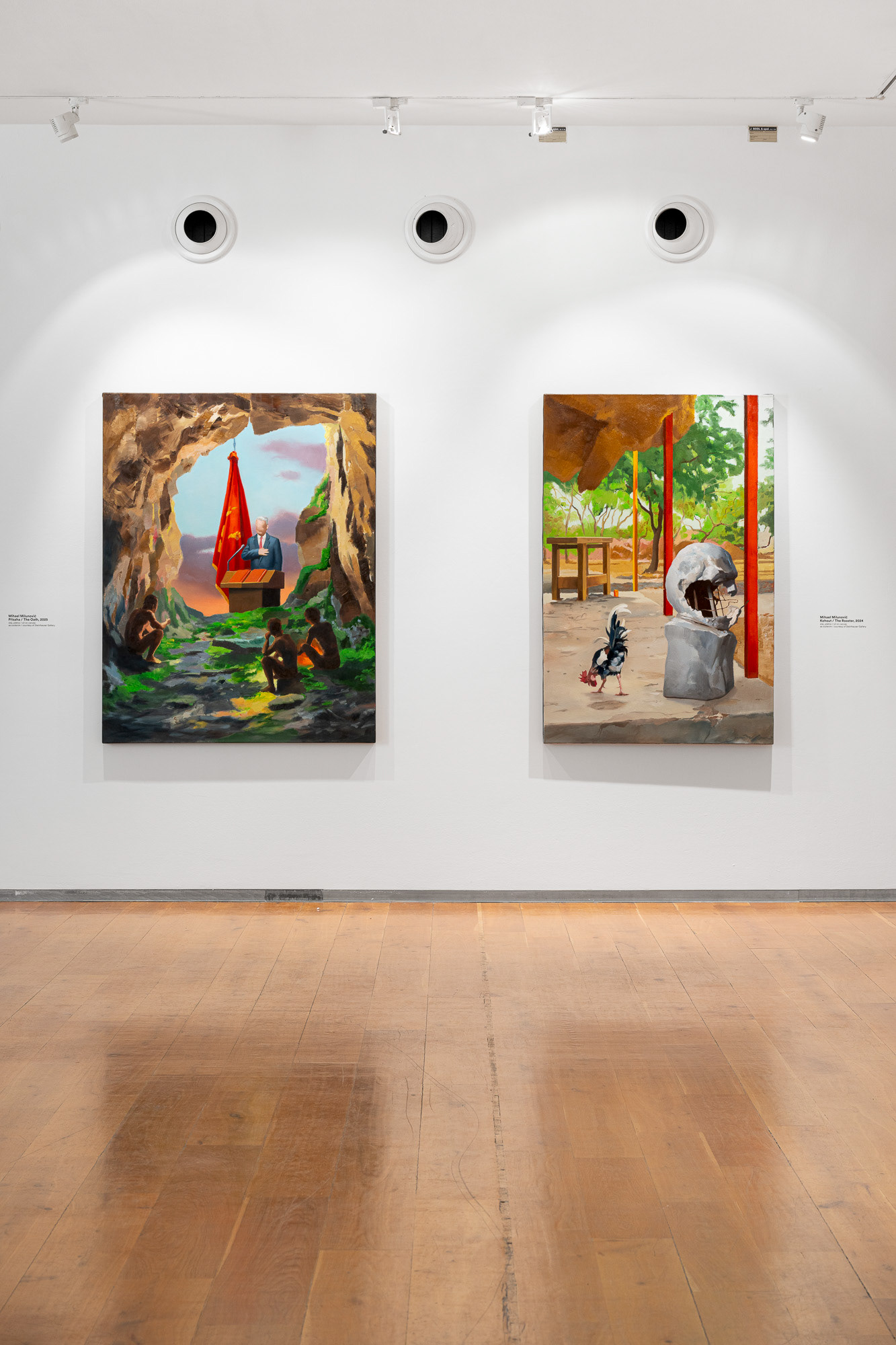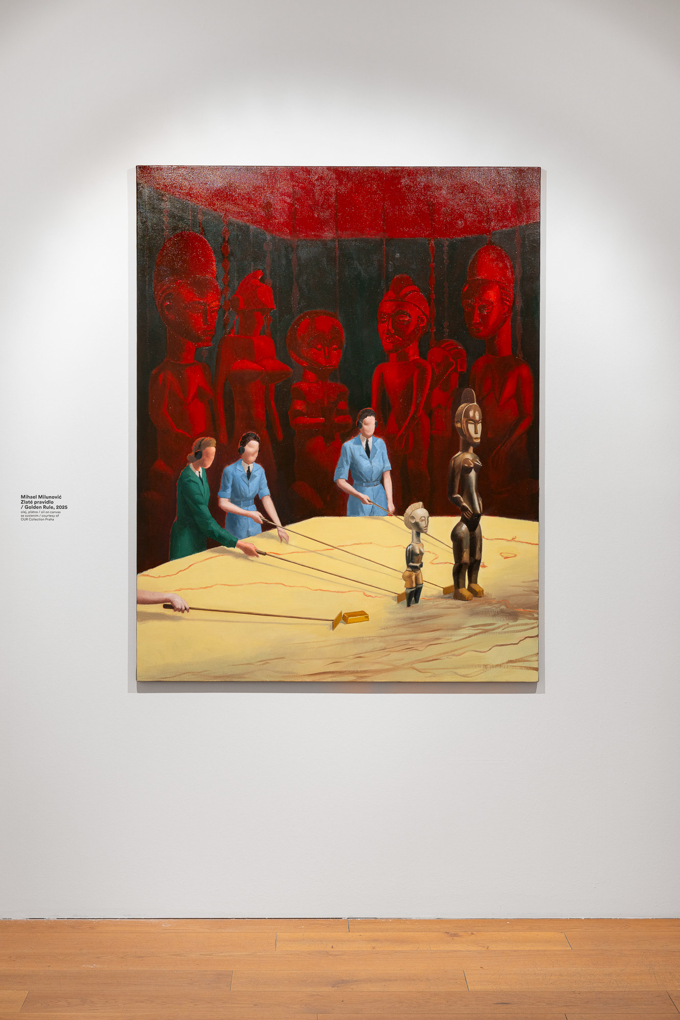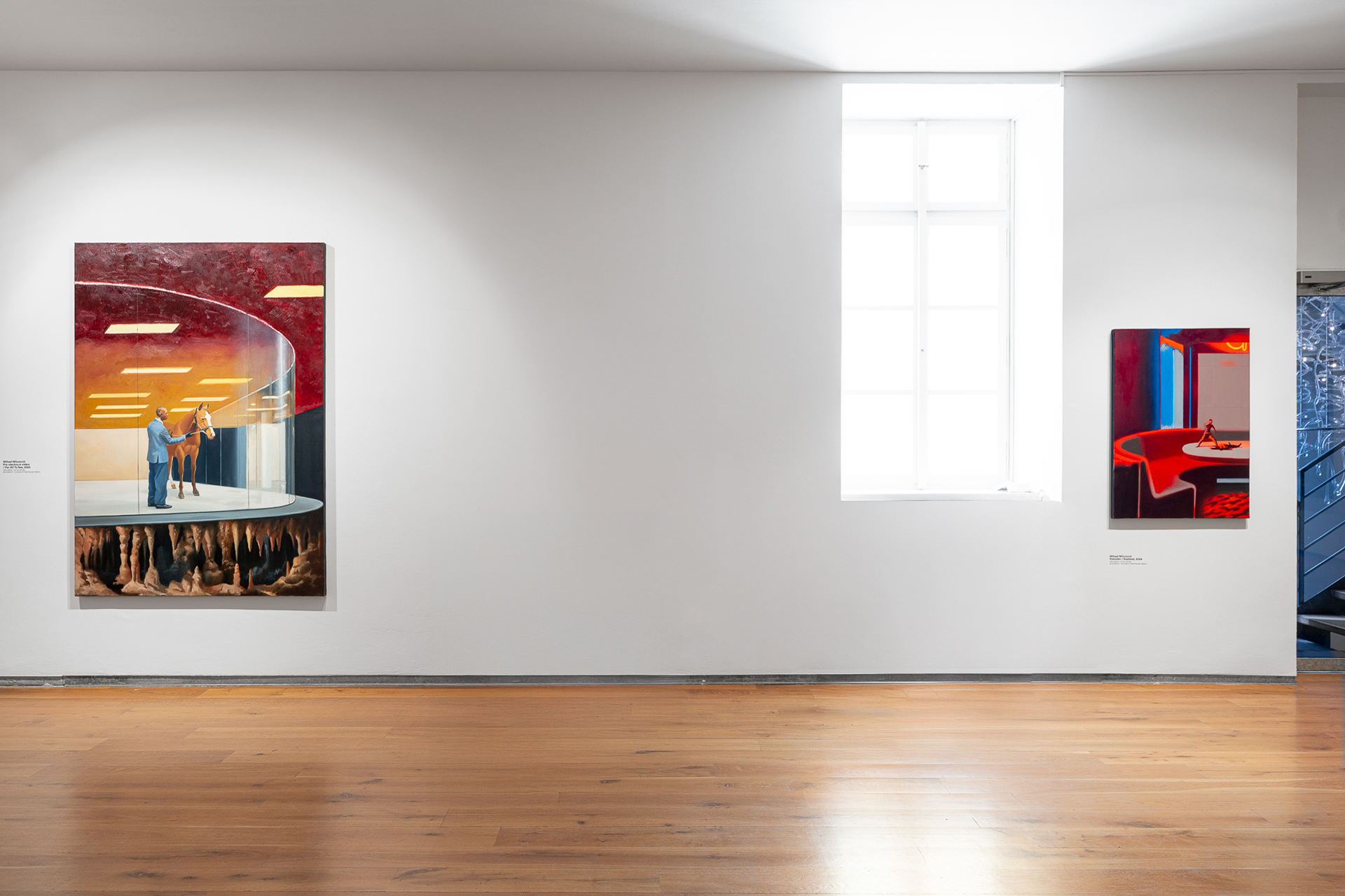 The joint exhibition brings together two artists of the same generation: Tilo Baumgärtel (b. 1972), based in Leipzig, and Mihael Milunović (b. 1967), who works and lives in between Paris and Belgrade. Each unfolds a distinct artistic universe, rich in layered visual narratives and shaped by singular dramaturgical strategies, set within a realm of a distorted reality. Both artists probe the human relationship to reality with nuance and sensitivity, subtly playing with the mechanics of depiction and the nature of perception. Beneath the surface of seemingly familiar scenes, they weave in subversive codes—echoes of psychological, social, political, historical, and imagined realities. Their works reveal a porous boundary through which memory, fiction, and the subconscious freely seep. Rather than depicting the world as it is, they bring to the fore irrationality, symbolism, and psychological events—often concealed beneath the surface of the everyday. Realism merges organically with the principles of surrealism, together revealing the tensions between power, vulnerability, and human estrangement.