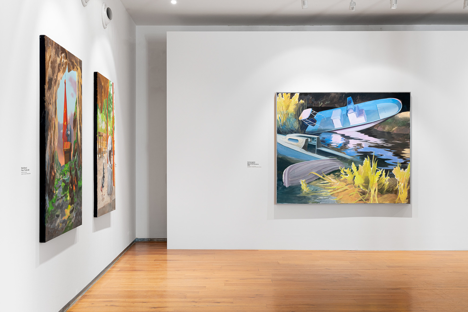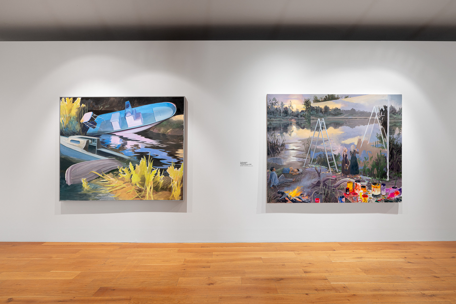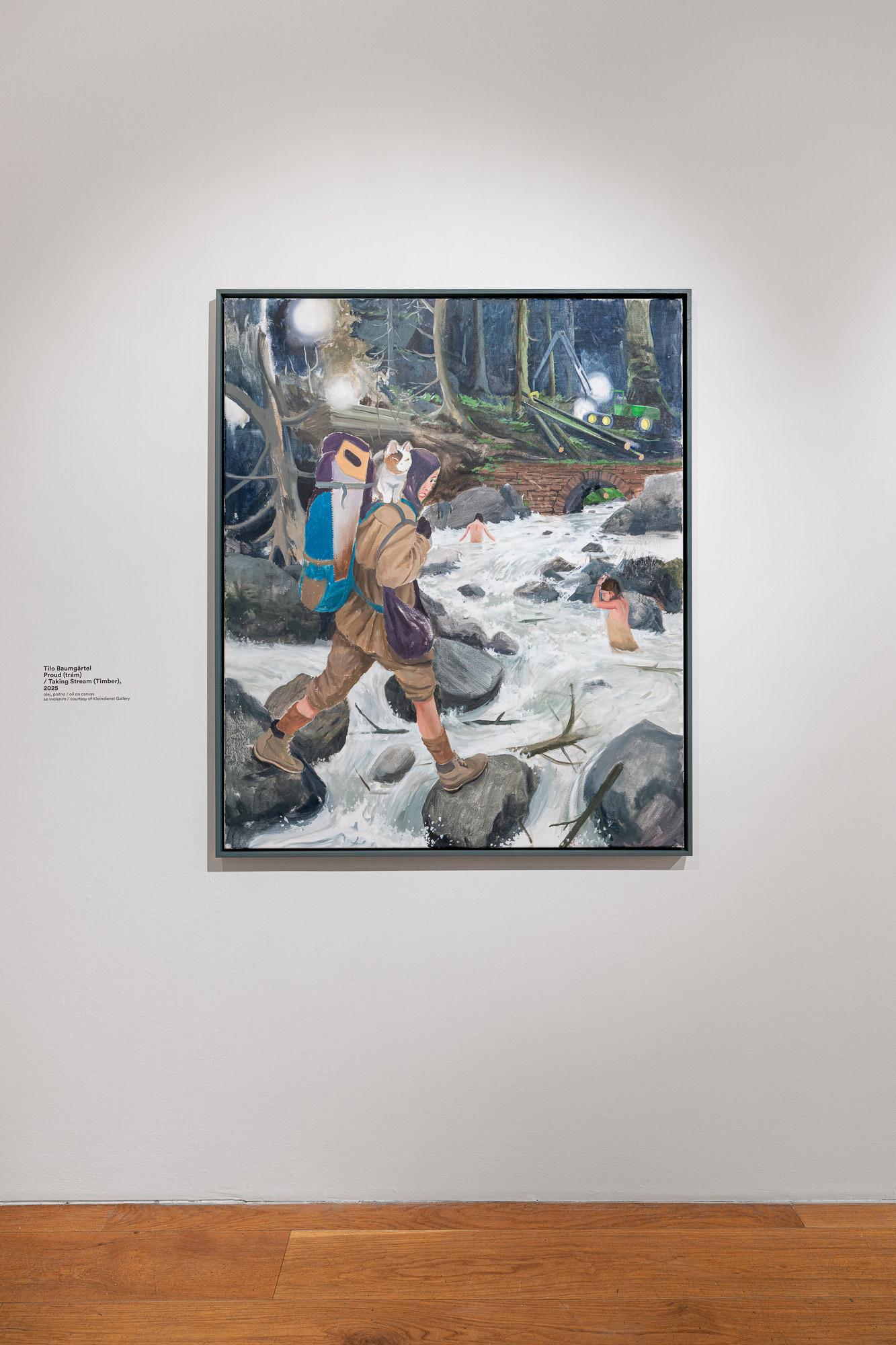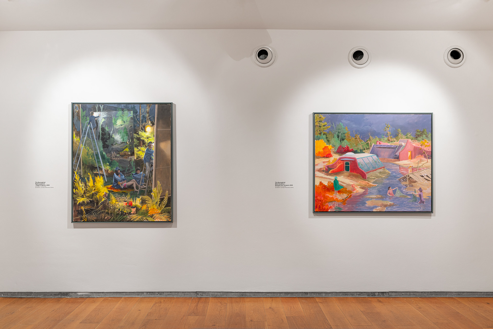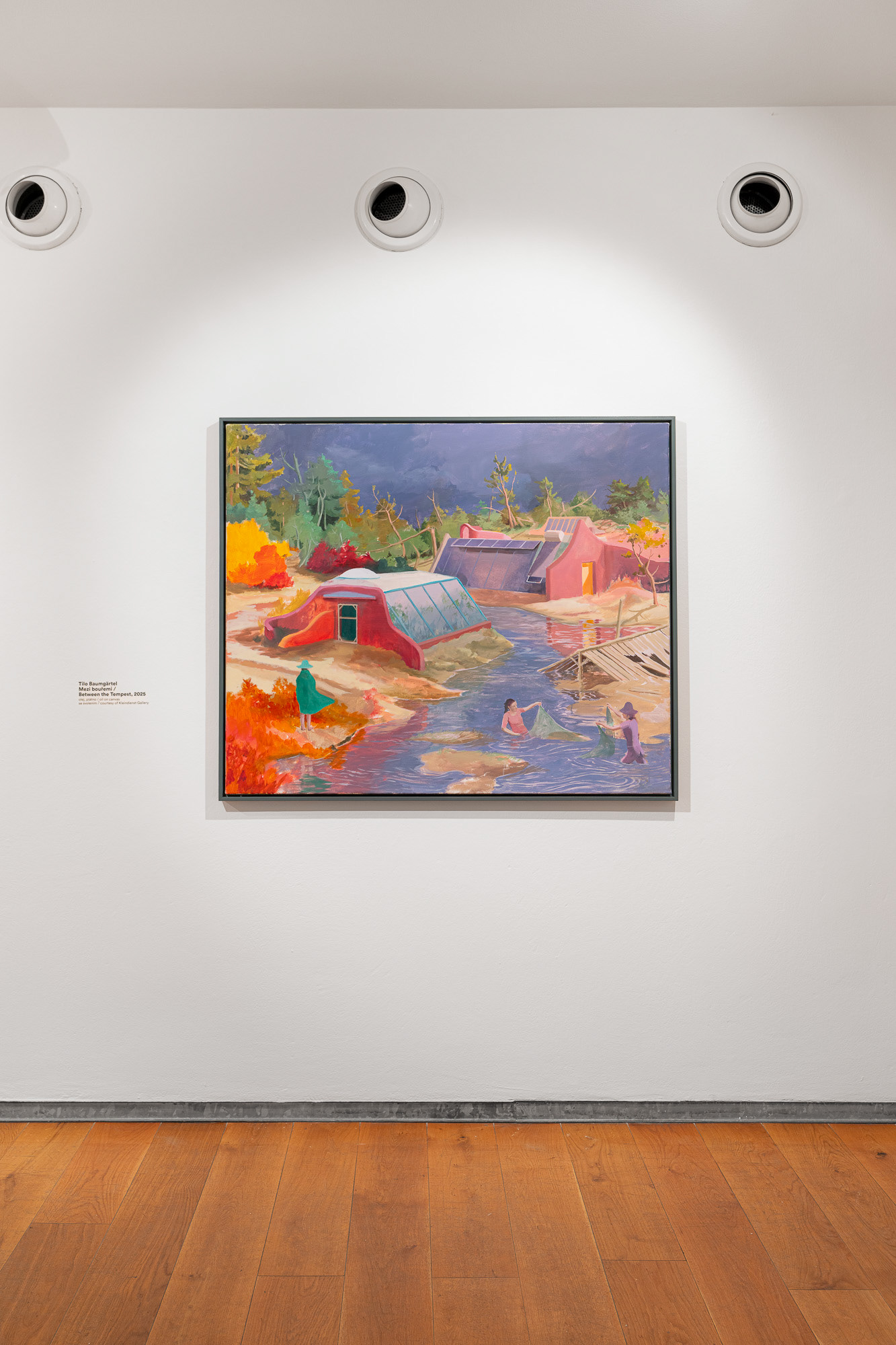 Natural elements and architectural structures offer the scenes movement, symbolic depth, and emotional resonance. In Baumgärtel’s paintings, landscapes take on a cinematic quality: wild rivers, flooded plains, dense forests, and nocturnal settings lit by dramatic sources that heighten their dreamlike tone and psychological tension. Water becomes a symbol of resilience, constant flux, and life itself. Architecture, by contrast, functions more as backdrop, — framing a dialogue between the natural and the constructed. At times, the absurdity of a scene is amplified by monumental canvases that mirror the surrounding landscape, subtly revealing the paradoxes of representation.