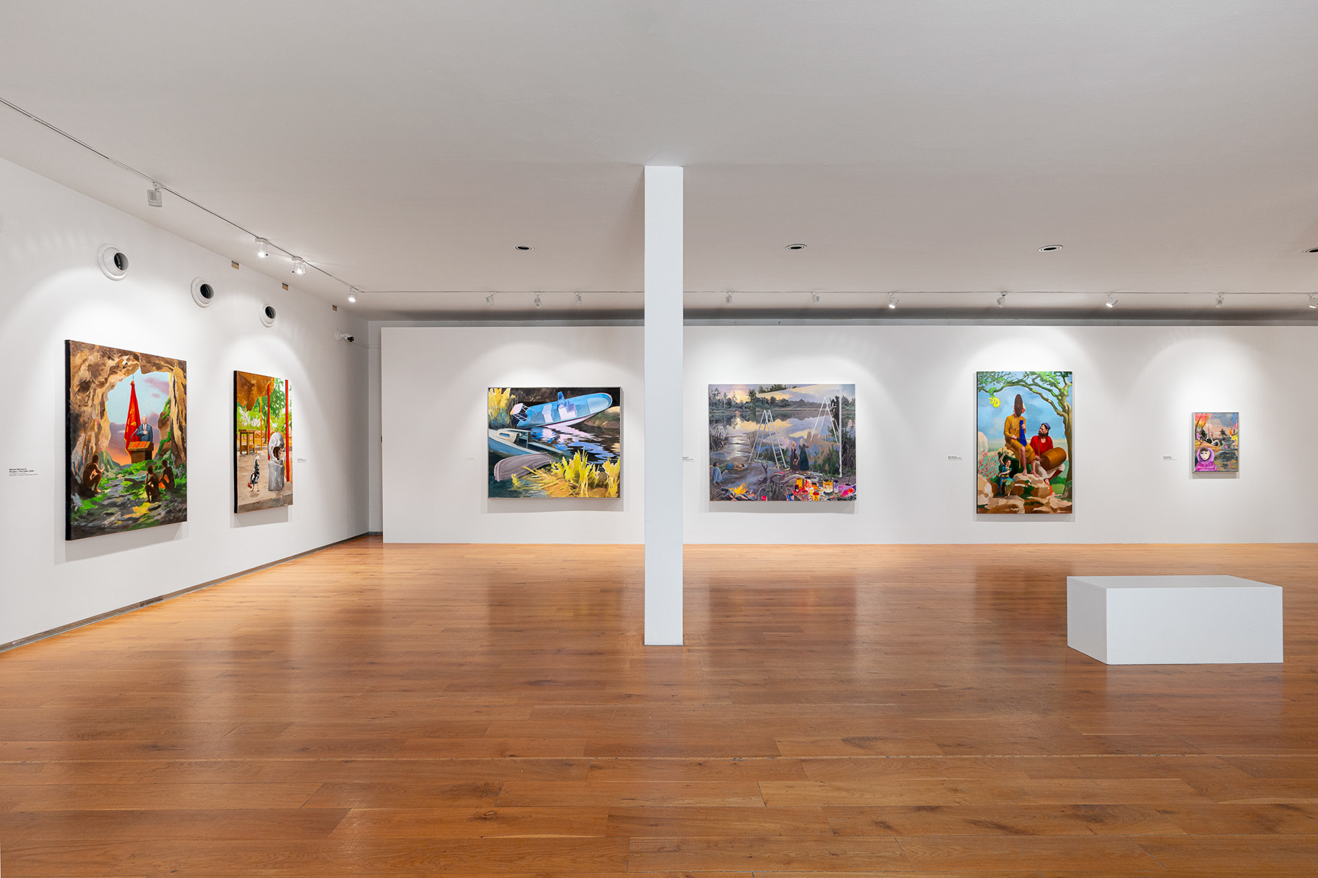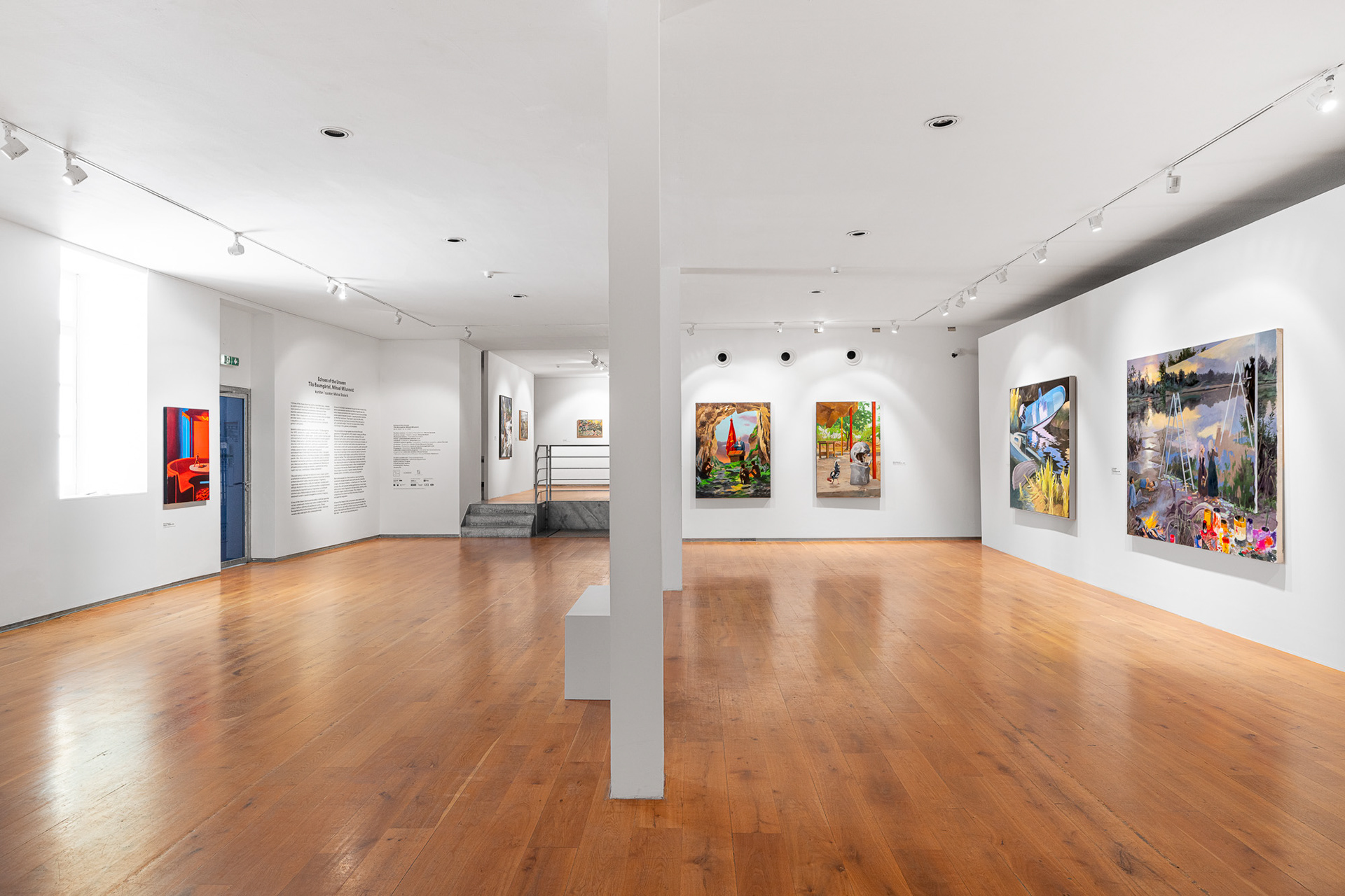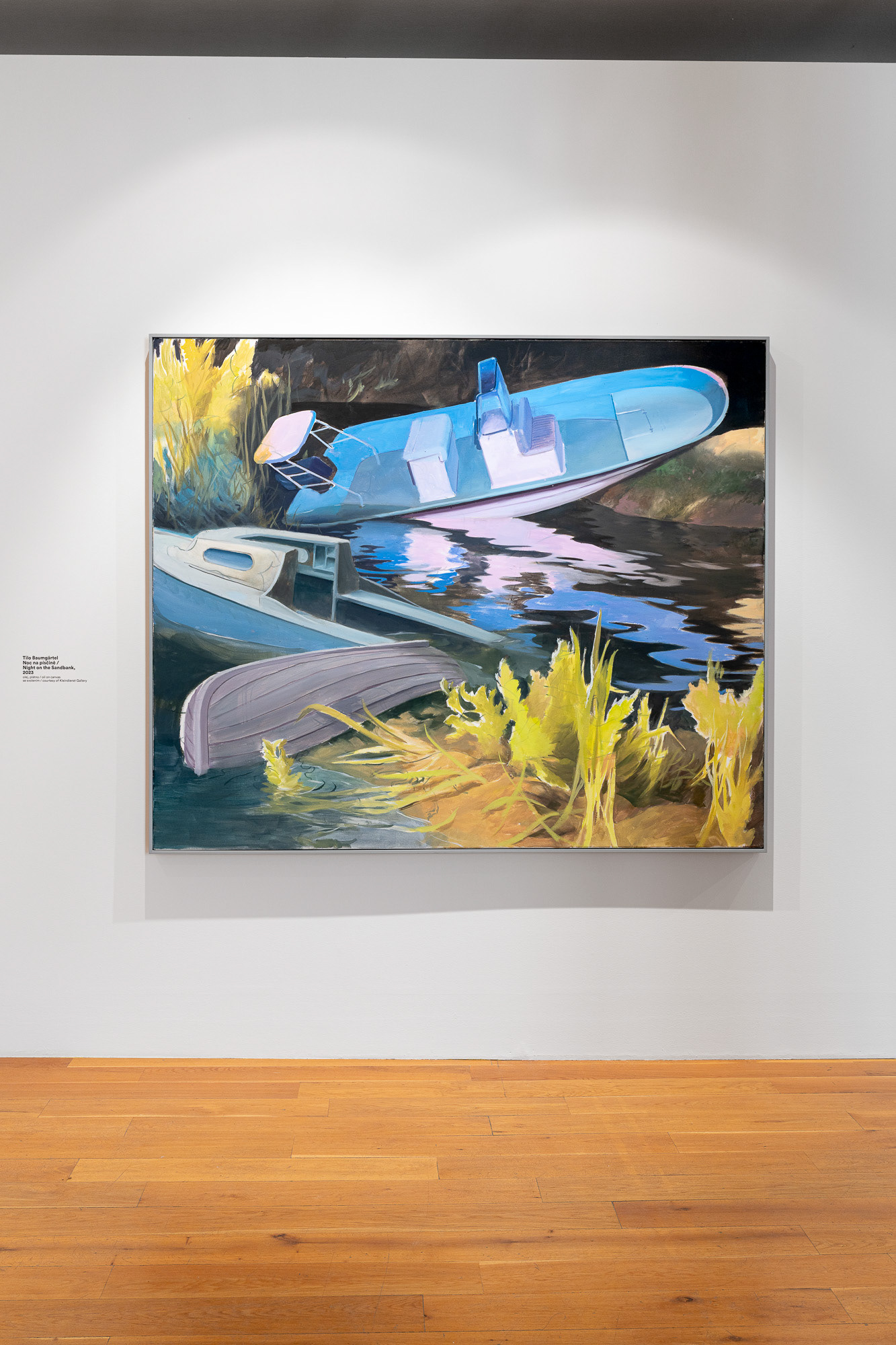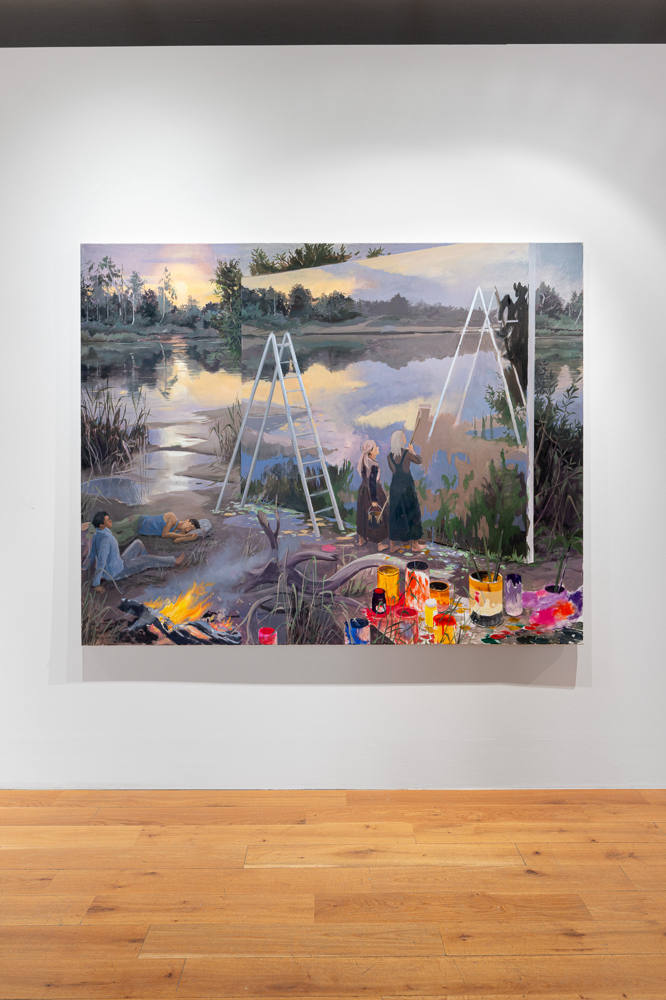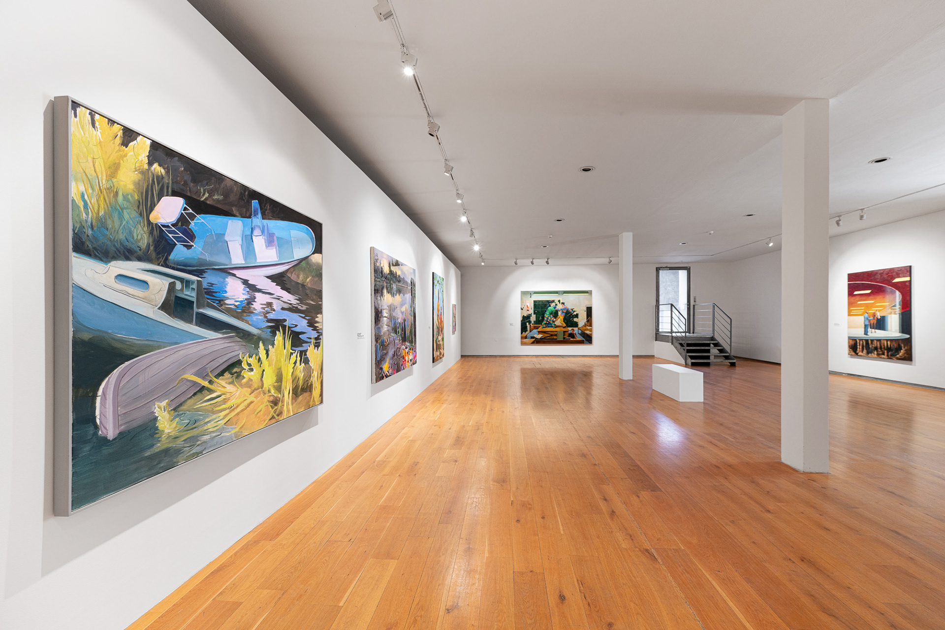 Natural elements and architectural structures offer the scenes movement, symbolic depth, and emotional resonance. In Baumgärtel’s paintings, landscapes take on a cinematic quality: wild rivers, flooded plains, dense forests, and nocturnal settings lit by dramatic sources that heighten their dreamlike tone and psychological tension. Water becomes a symbol of resilience, constant flux, and life itself. Architecture, by contrast, functions more as backdrop, — framing a dialogue between the natural and the constructed. At times, the absurdity of a scene is amplified by monumental canvases that mirror the surrounding landscape, subtly revealing the paradoxes of representation.