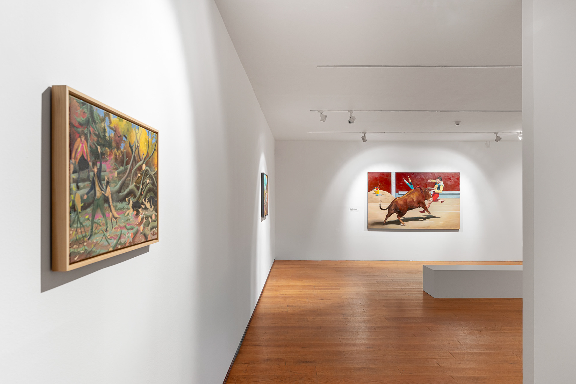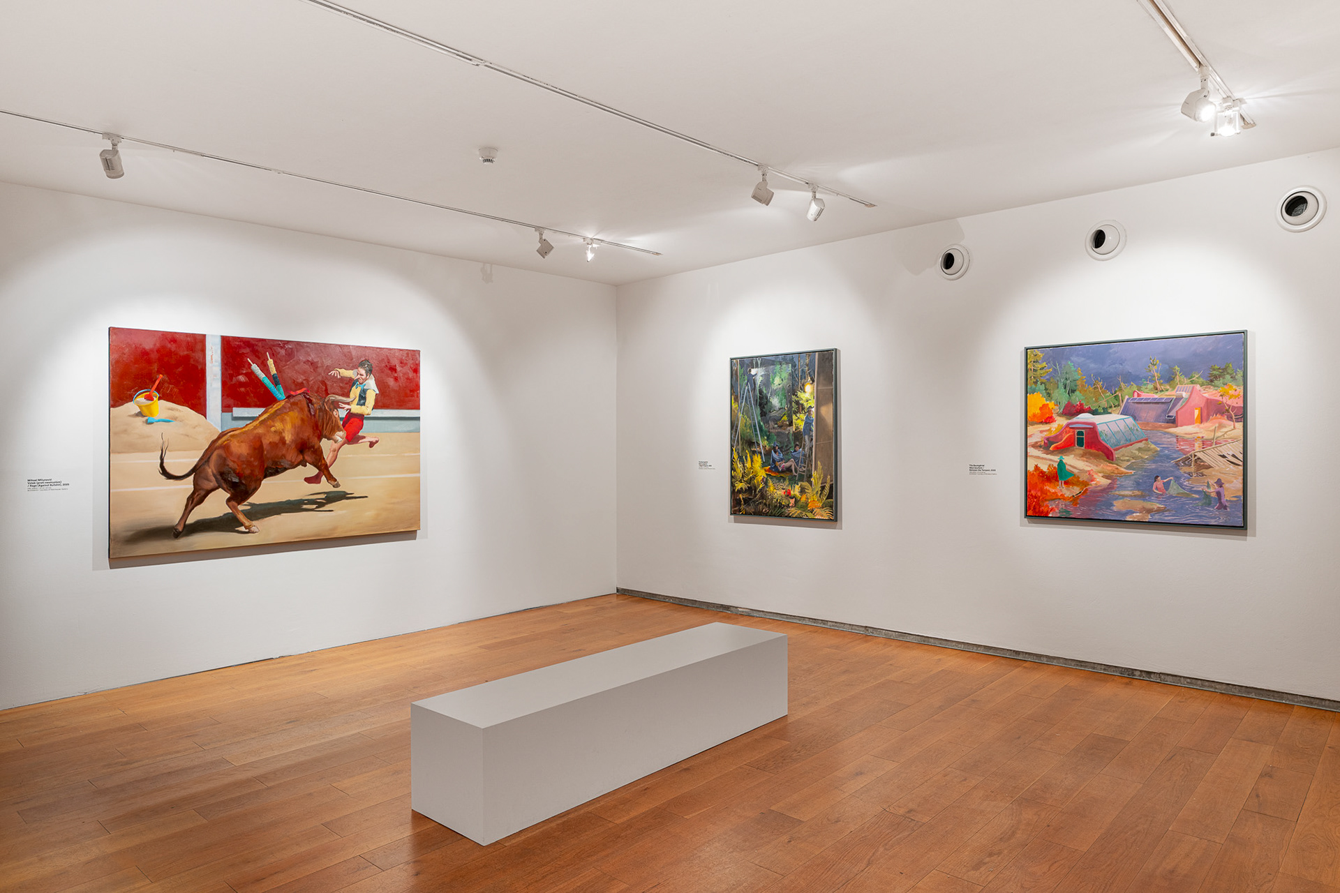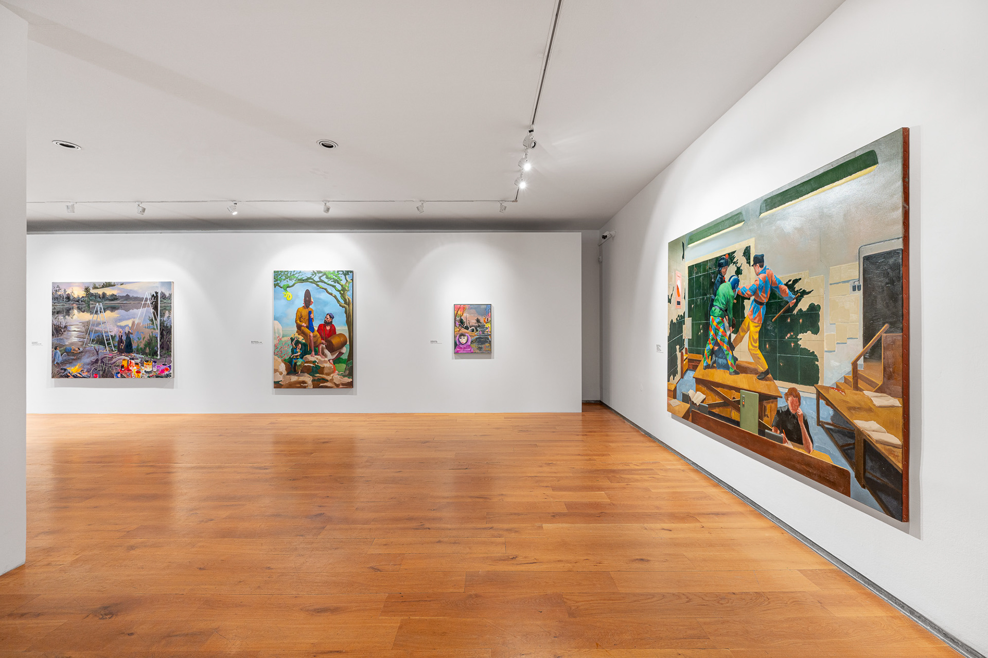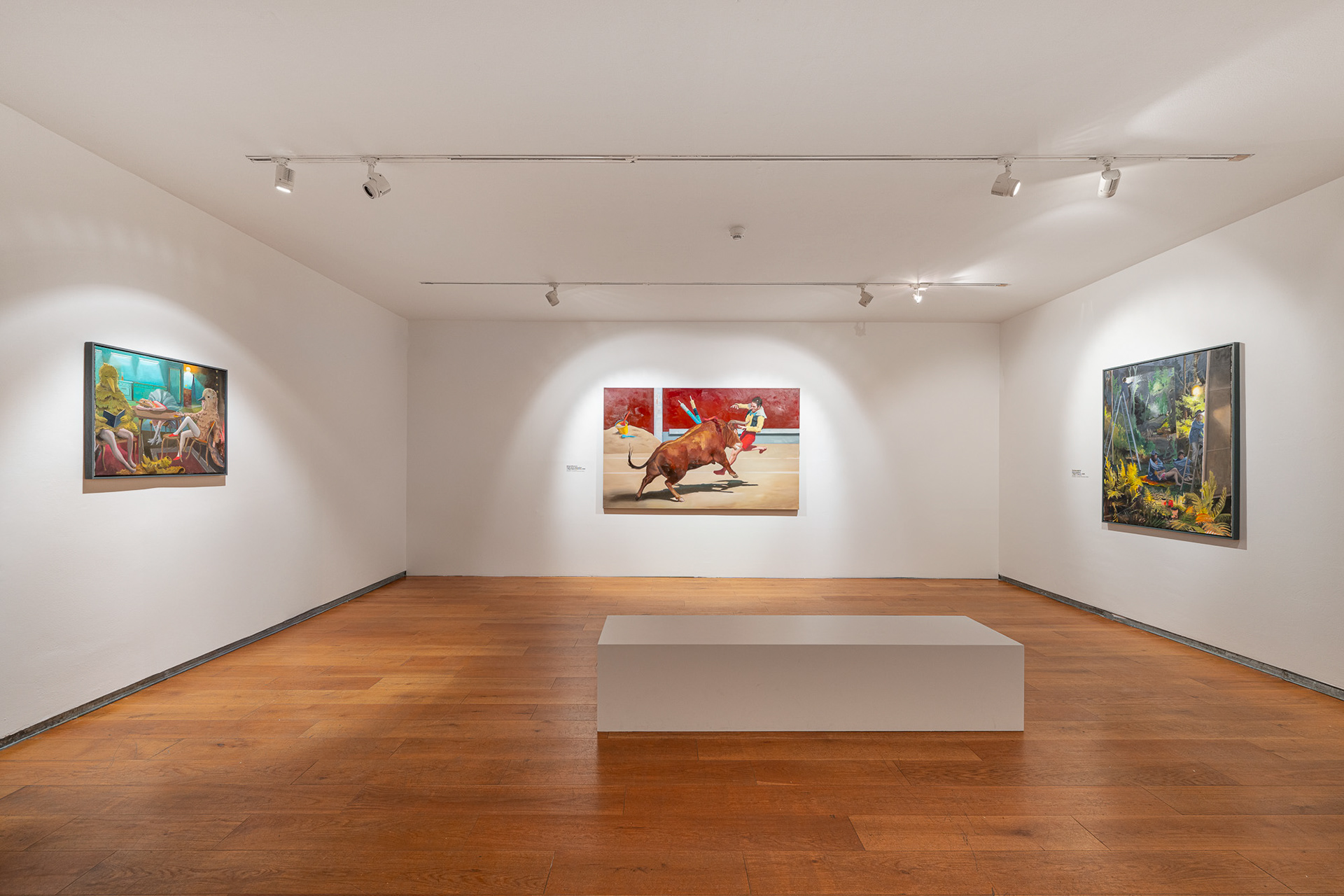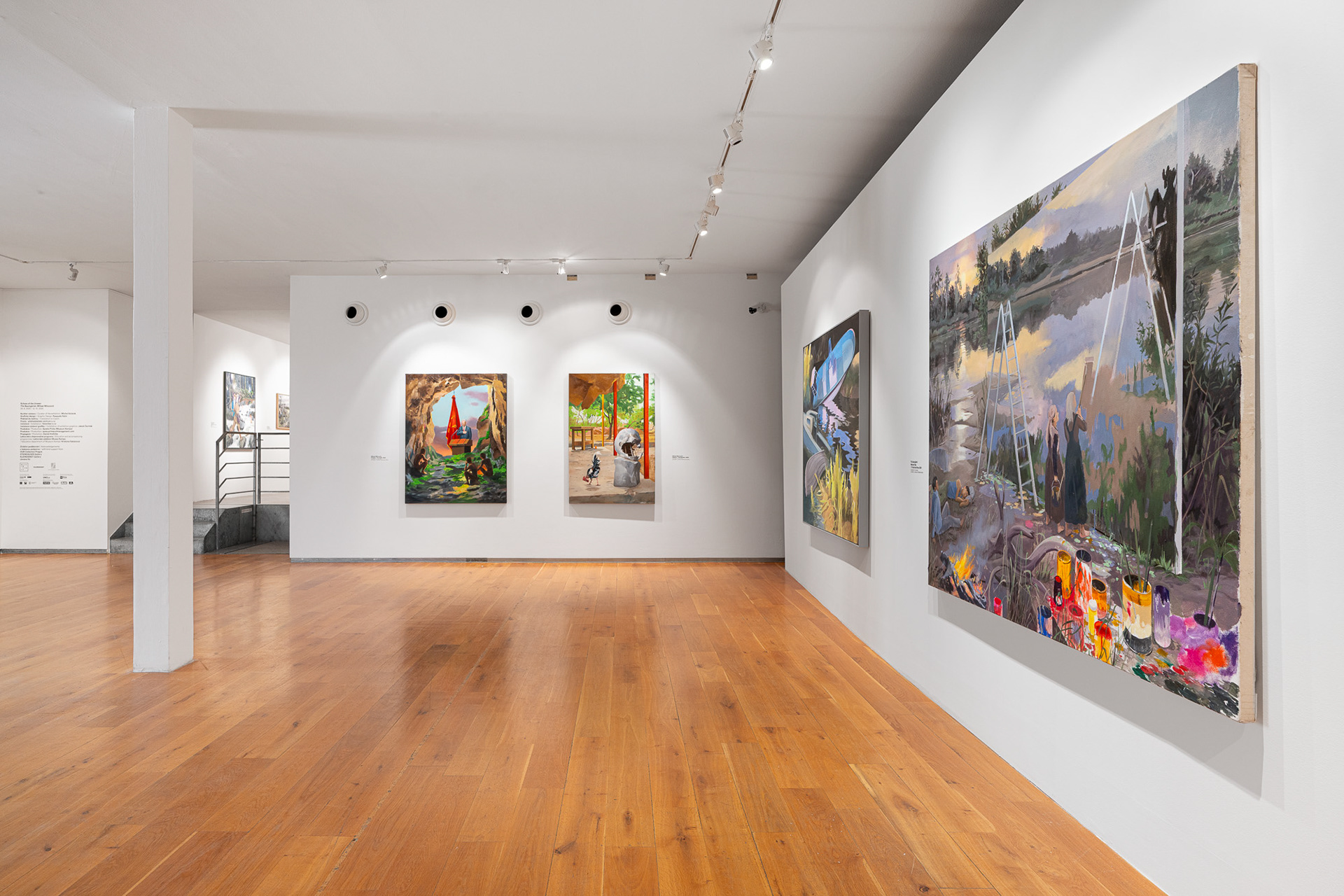 Natural elements and architectural structures offer the scenes movement, symbolic depth, and emotional resonance. In Baumgärtel’s paintings, landscapes take on a cinematic quality: wild rivers, flooded plains, dense forests, and nocturnal settings lit by dramatic sources that heighten their dreamlike tone and psychological tension. Water becomes a symbol of resilience, constant flux, and life itself. Architecture, by contrast, functions more as backdrop, — framing a dialogue between the natural and the constructed. At times, the absurdity of a scene is amplified by monumental canvases that mirror the surrounding landscape, subtly revealing the paradoxes of representation.