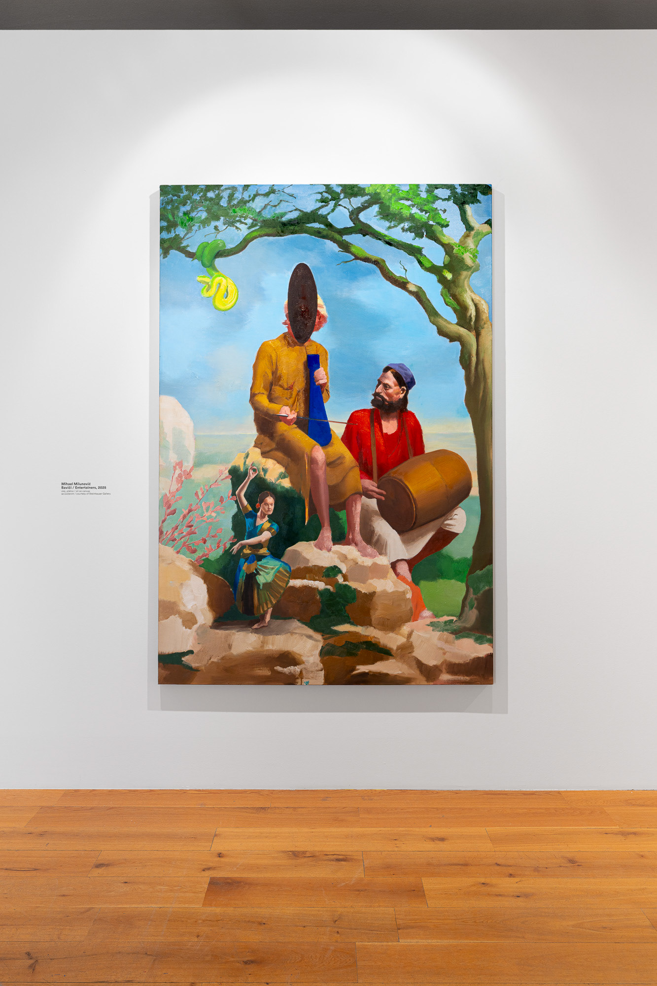 At the heart of these often-tense scenarios are figures whose presence invites a flurry of questions. In Baumgärtel’s work, they appear as silent yet active agents, embedded within the scene. Milunović stages his characters with theatrical precision, placing them within a carefully orchestrated mise-en-scène. They bewilder the viewer with their ambiguous proportions and elusive nature, in an environment where natural elements often contrast with brutalist and modernist architectural forms. While Baumgärtel’s compositions may initially resemble cinematic stills, subtle dislocations, visual ellipses and quiet ruptures gradually unsettle the scene, leaving his characters balance between the familiar and the unknown.
