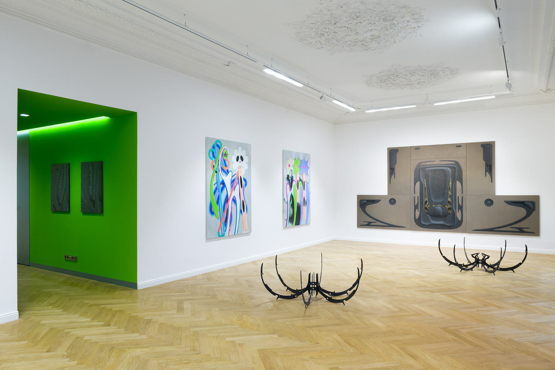 The exhibition presents a selection of paintings and sculptures by artists from Italy, Hungary and the Czech Republic. Figurative compositions depict a range of human and mythological figures dominating the scene. Some figures are haunting and demonic; others exude a dreamlike romance. Their otherworldly forms and peculiar physical traits invite us into a realm of fantasy and imagination. Interwoven with natural motifs, surreal still-lifes, and abstract gestures, these works cultivate an atmosphere where tranquillity and tension coexist – fleeting moments juxtaposed with strikingly realistic scenes. Through emotionally charged scenes, with lavish symbolism and metaphor, the artists reveal their personal experiences and intimate narratives.