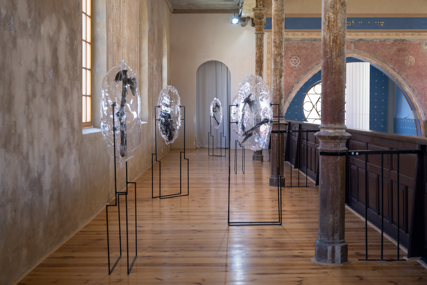 The group exhibition, anchored in the space, history, and the atmosphere of the Trnava Synagogue, is a selection of young and mid generation artists from Slovakia, Hungary, the Czech Republic, and Austria. Connected to the topic of fragility in multiple layers, the multimedia selection naturally shifts from painting to sculptures, installations, and videos. The narratives of selected artworks, underlining transience of human life, and existence as such form a central motif of the project. The chosen artworks speak about natural evolution, the end of the world or, alternatively, an impossible and unnatural effort to stop time and preserve the present. The strong symbolism of motifs and materials used underscores the lyrical facet of the display of works, complemented by their formal aspects, with suggestive use of materials, their stability, durability, and visual representation. Although the project does not offer a direct reaction to the history associated with the Jewish culture, or unrelenting echoes of global pandemics and wars, their presence remains to a subconscious memento, a warning finger of the exhibition itself.