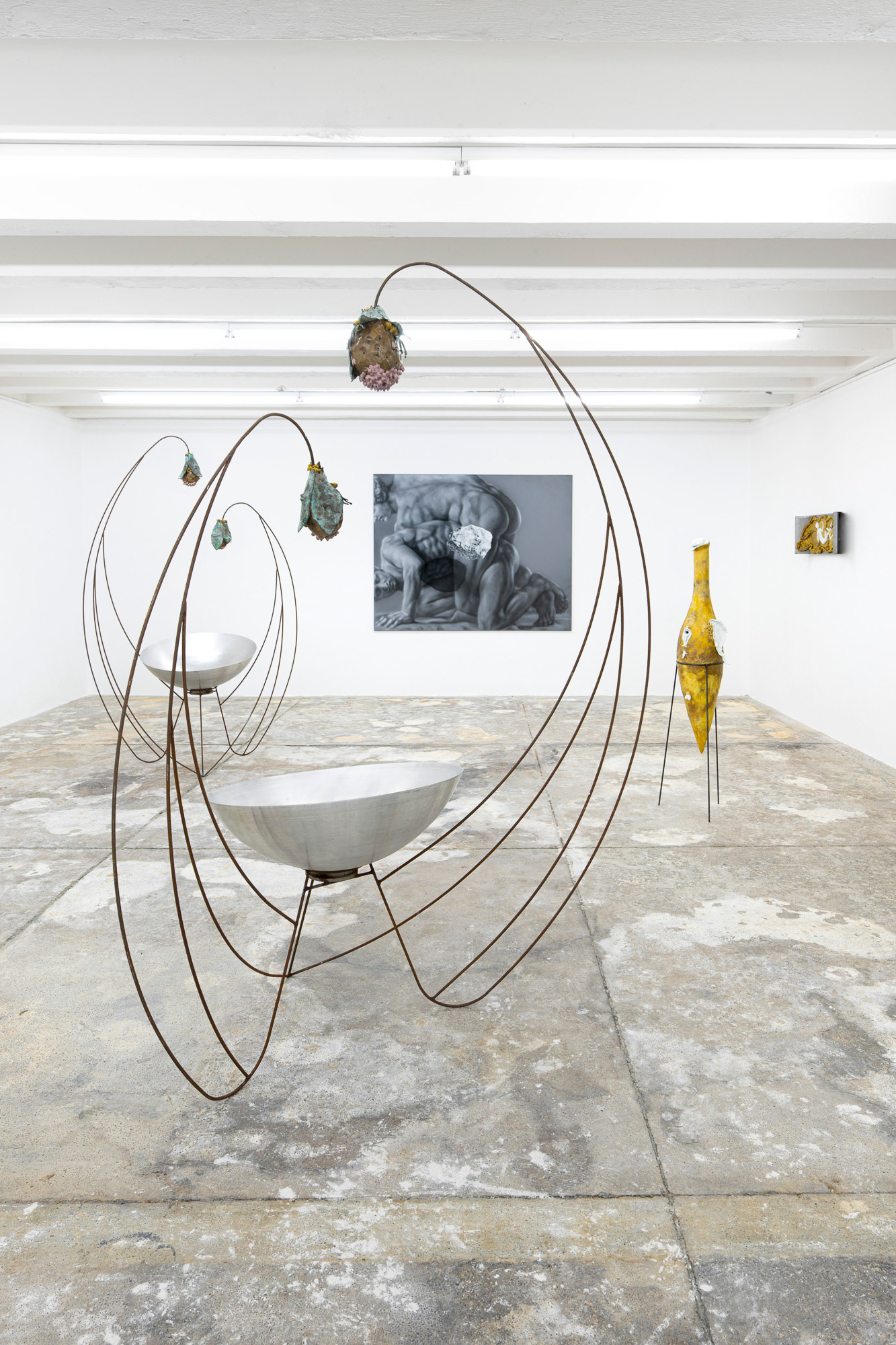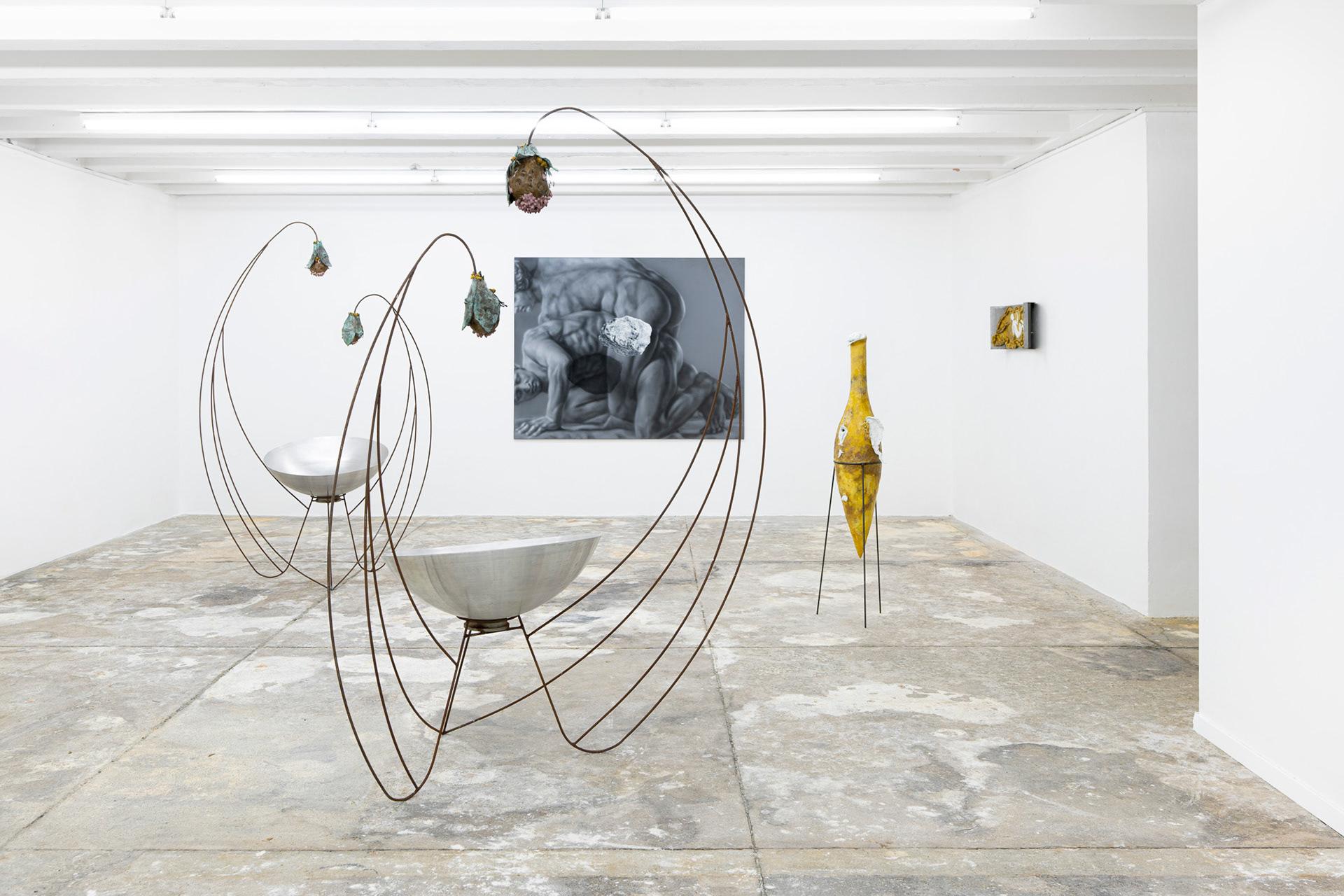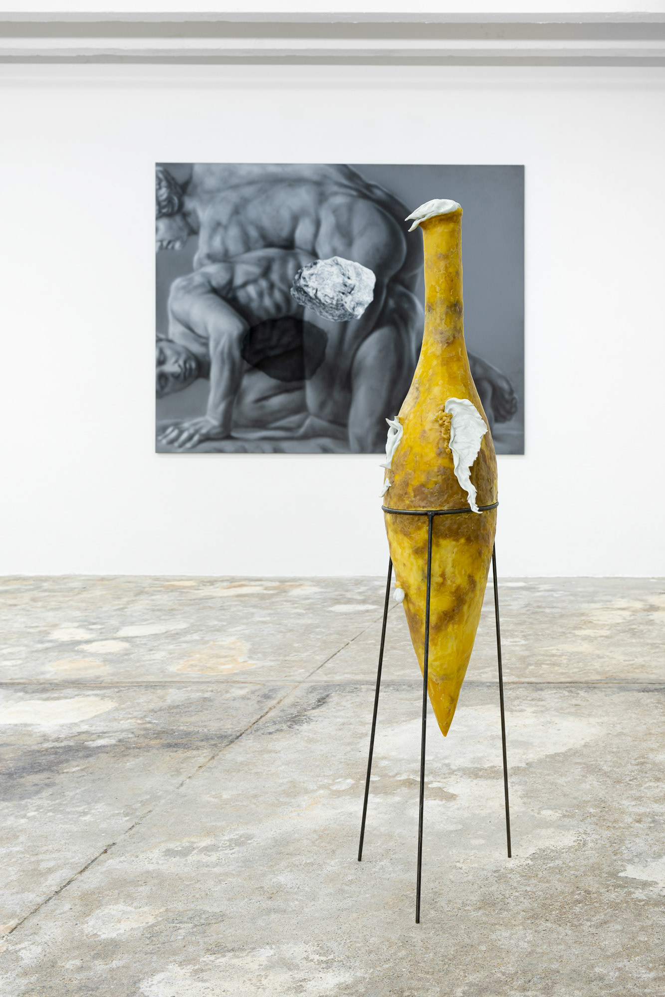 The joint exhibition by Gideon Horváth and Adam Šakový explores the paradox of the present and the absent, of the depicted and the intuited, while questioning the established certainties of the physical world. By way of the material qualities and figural scenes, it recounts unspoken desires, distant memories, as well as sensuality, tension, stigma, shame, and sin. First-time pairing of their works brings together a contrast of materials, forms, themes, and media – wax meets metal, body meets stone, nature meets humanity, realism meets fiction, and painting meets installation. Both artists demonstrate a keen sensitivity to history and art history, employing mythological references updated through personal experience. The exhibition project creates a space where irrational relations, the boundaries between reality and fiction, or past and present intertwine.