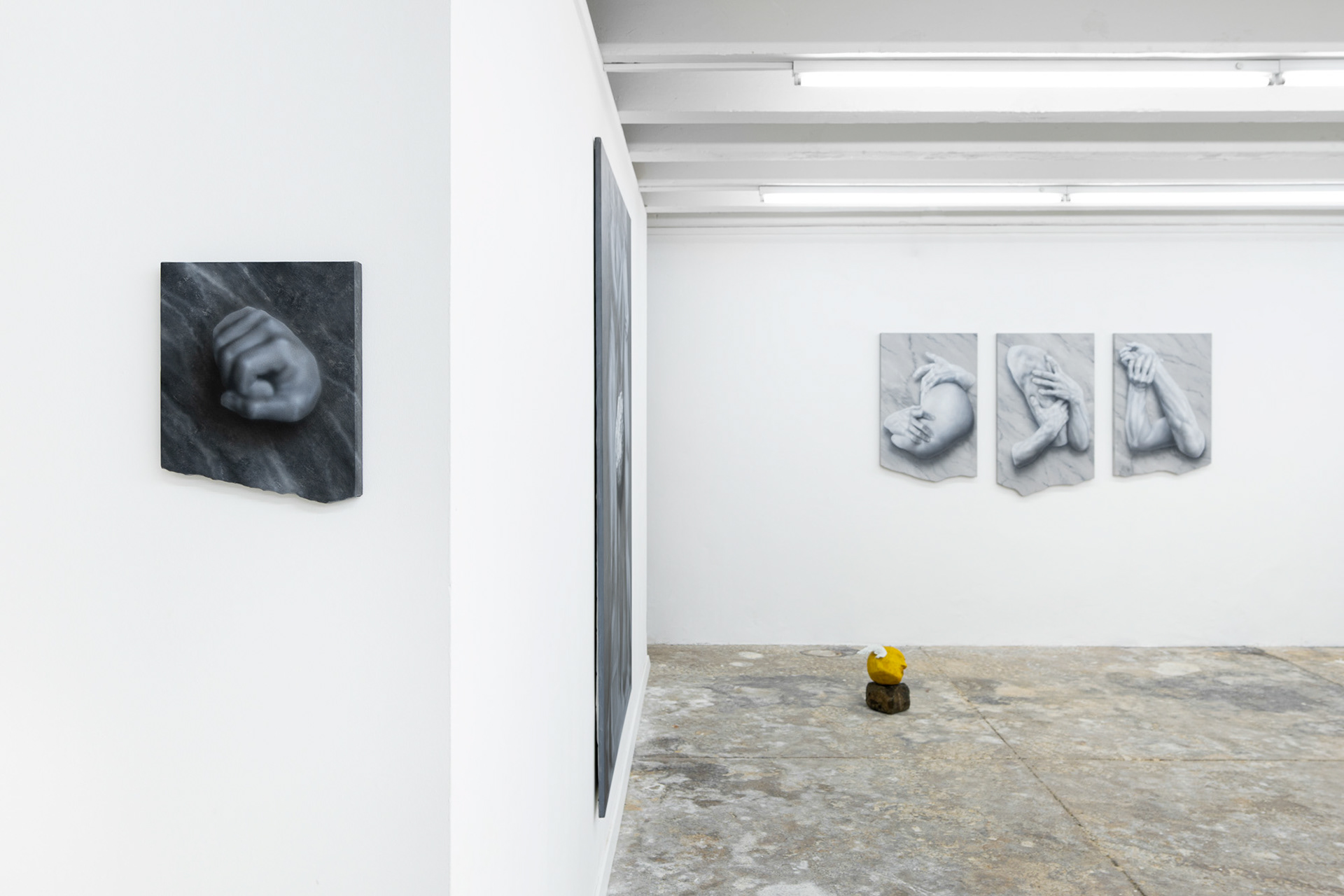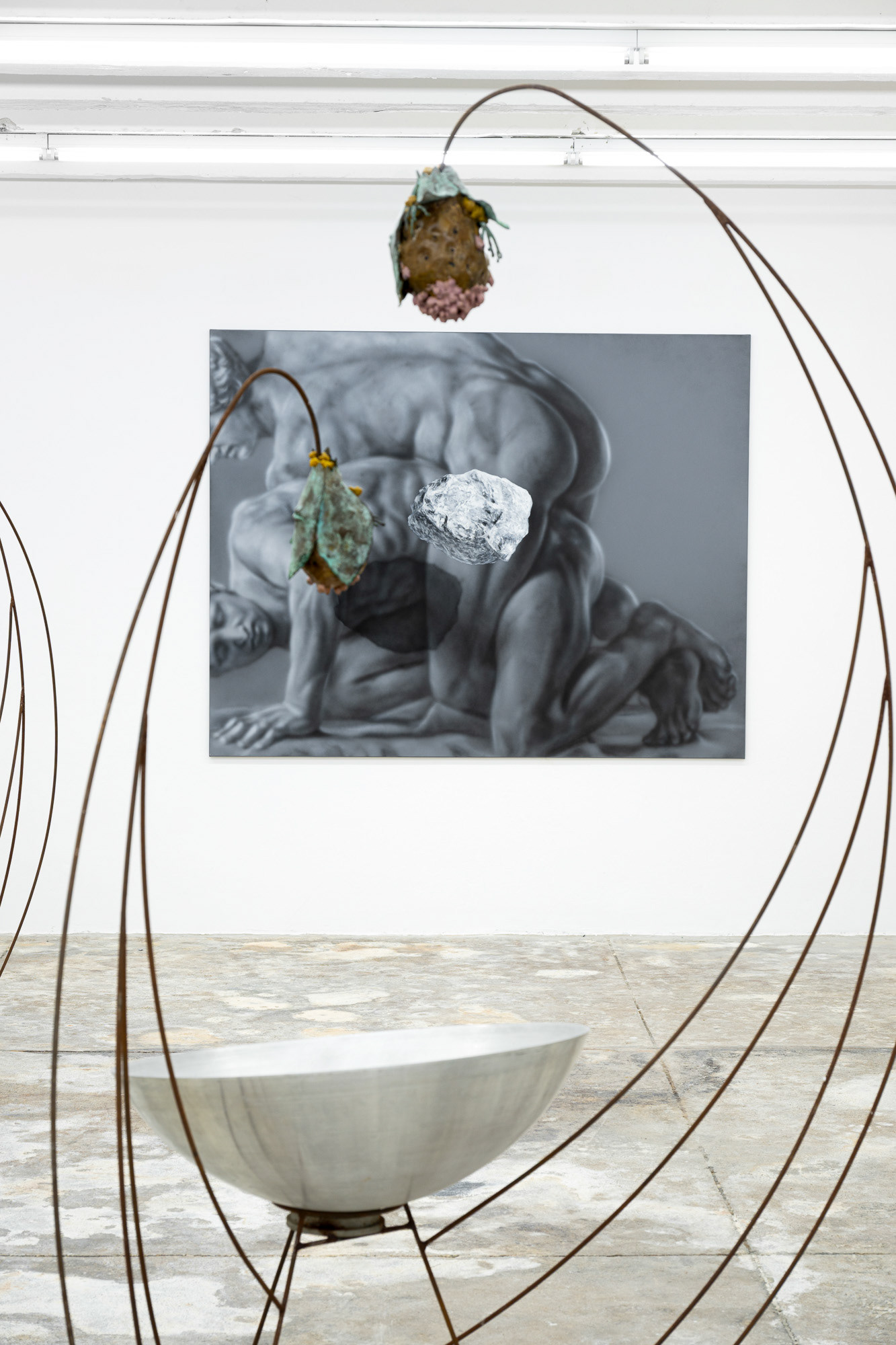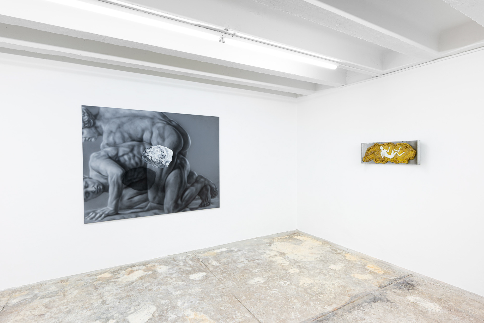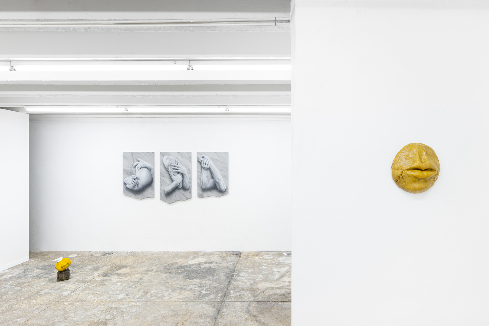 The exhibition Phantom Matter approaches the body as a physical material, a symbolic element, and direct agent of the narrative. Through physicality, it explores the inherent tension between existence and absence, reflects on stability and fragility, and juxtaposes mythical eternity with romantic ephemerality. It invites a haptic encounter, carries scents, conveys a fleeting touch or a passionate embrace. It is at once cold and warm, soft and hard, moist and dry.