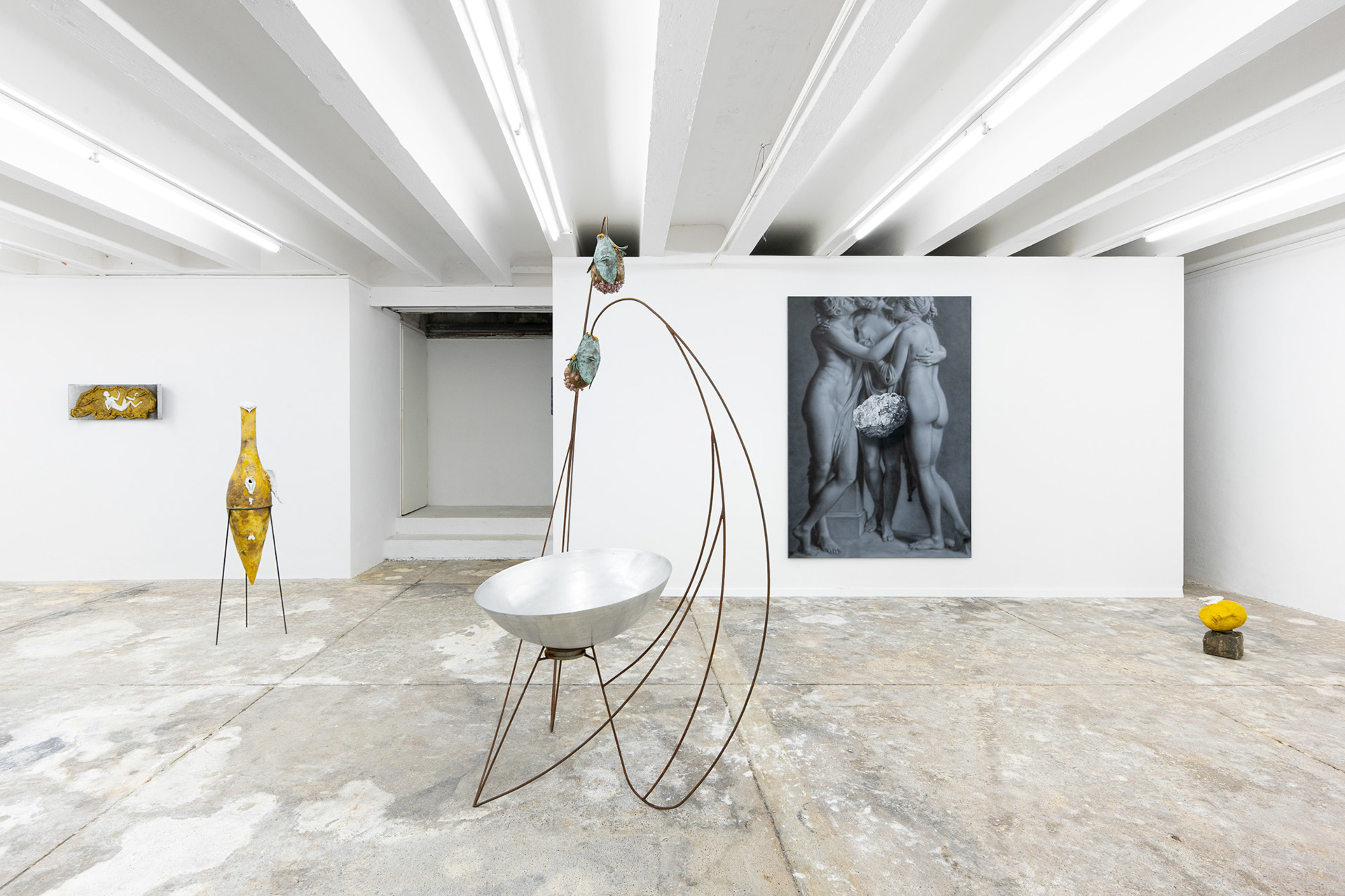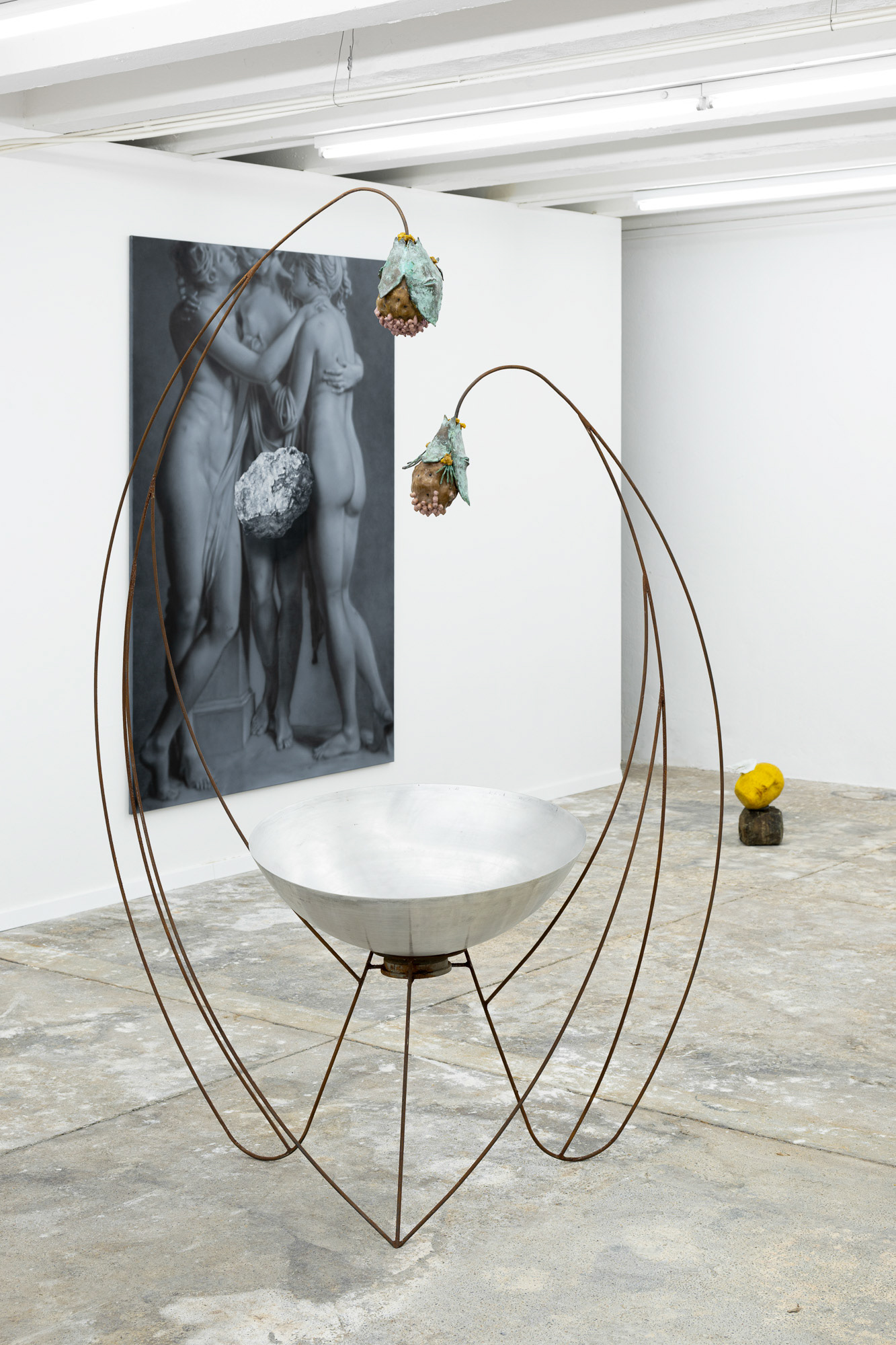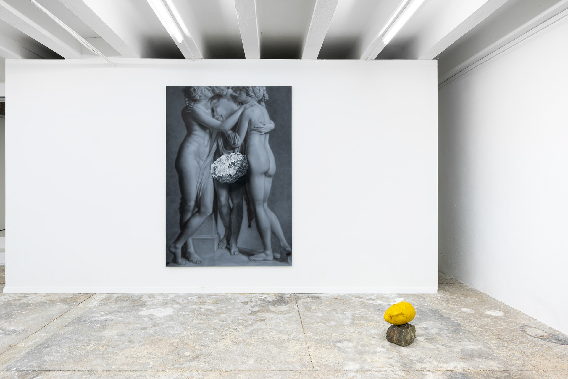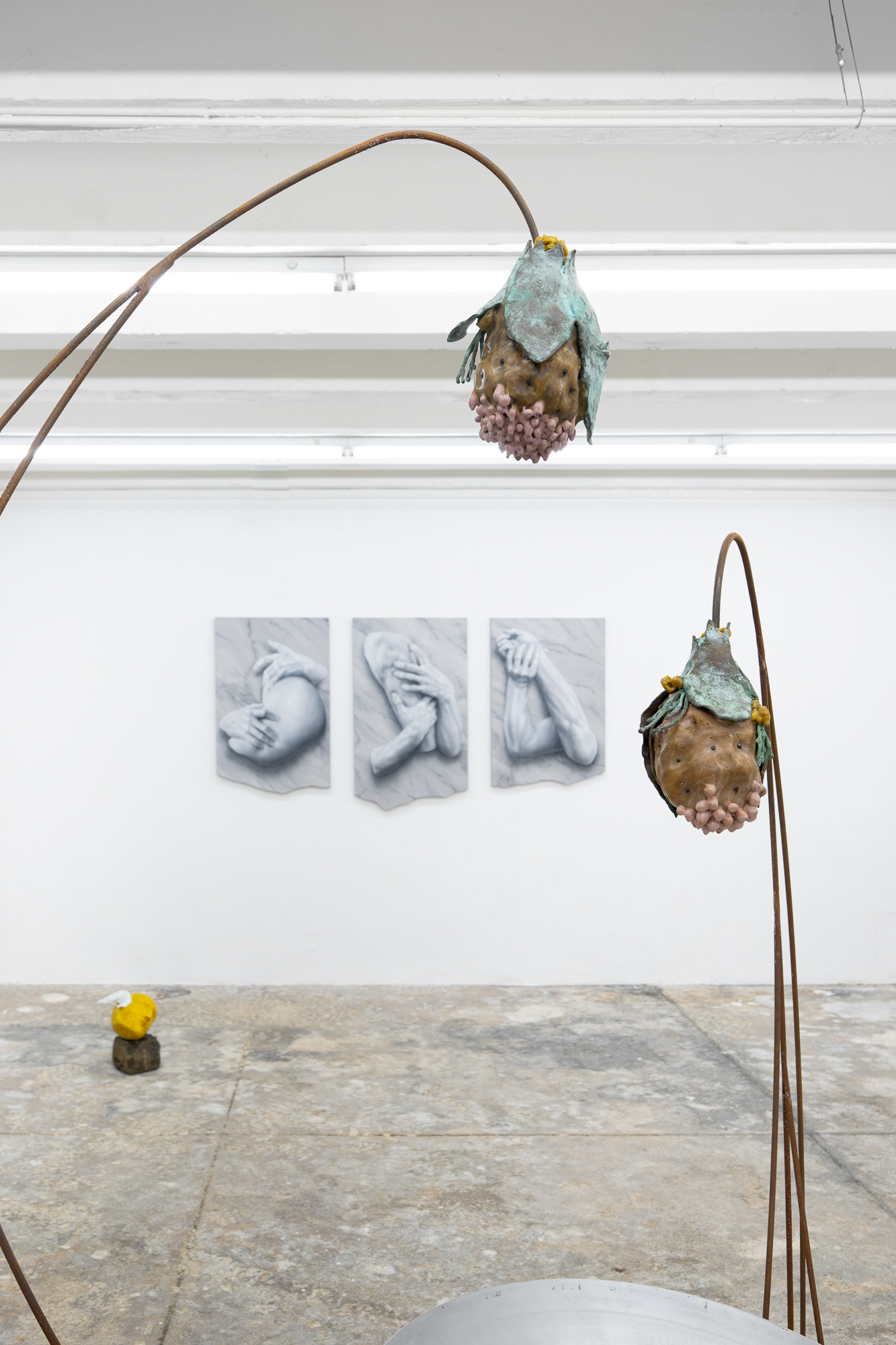 The exhibition Phantom Matter approaches the body as a physical material, a symbolic element, and direct agent of the narrative. Through physicality, it explores the inherent tension between existence and absence, reflects on stability and fragility, and juxtaposes mythical eternity with romantic ephemerality. It invites a haptic encounter, carries scents, conveys a fleeting touch or a passionate embrace. It is at once cold and warm, soft and hard, moist and dry.