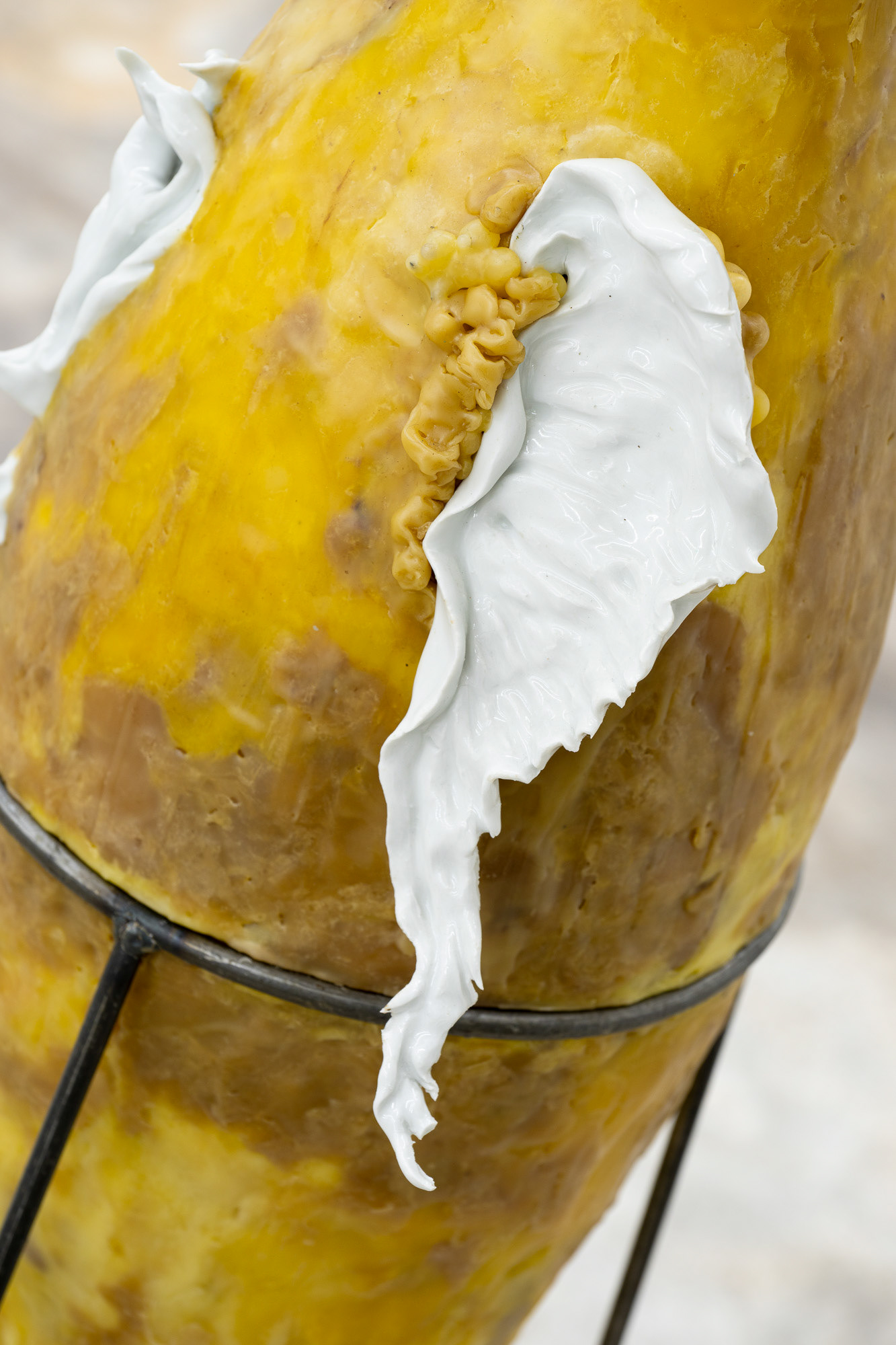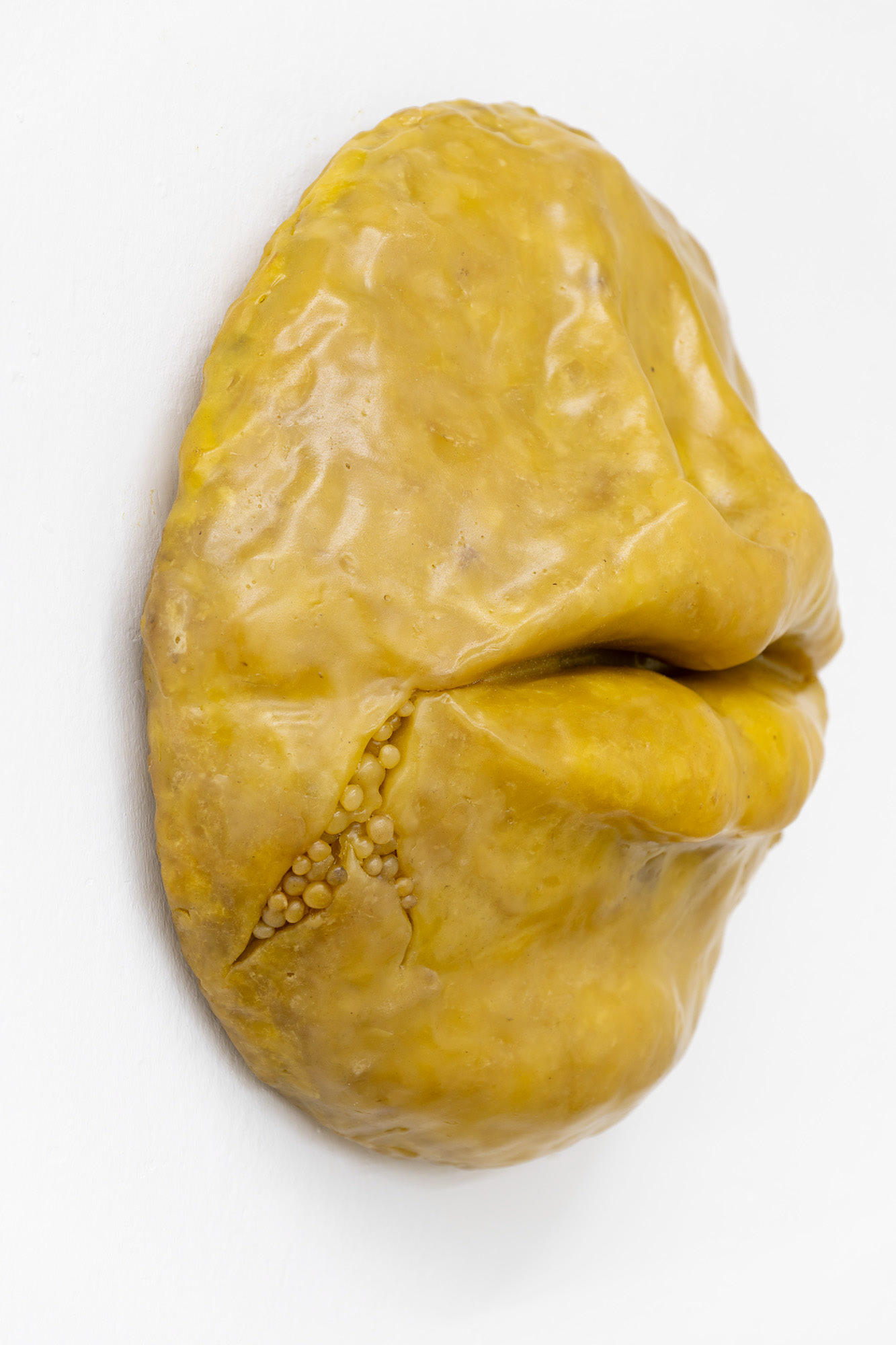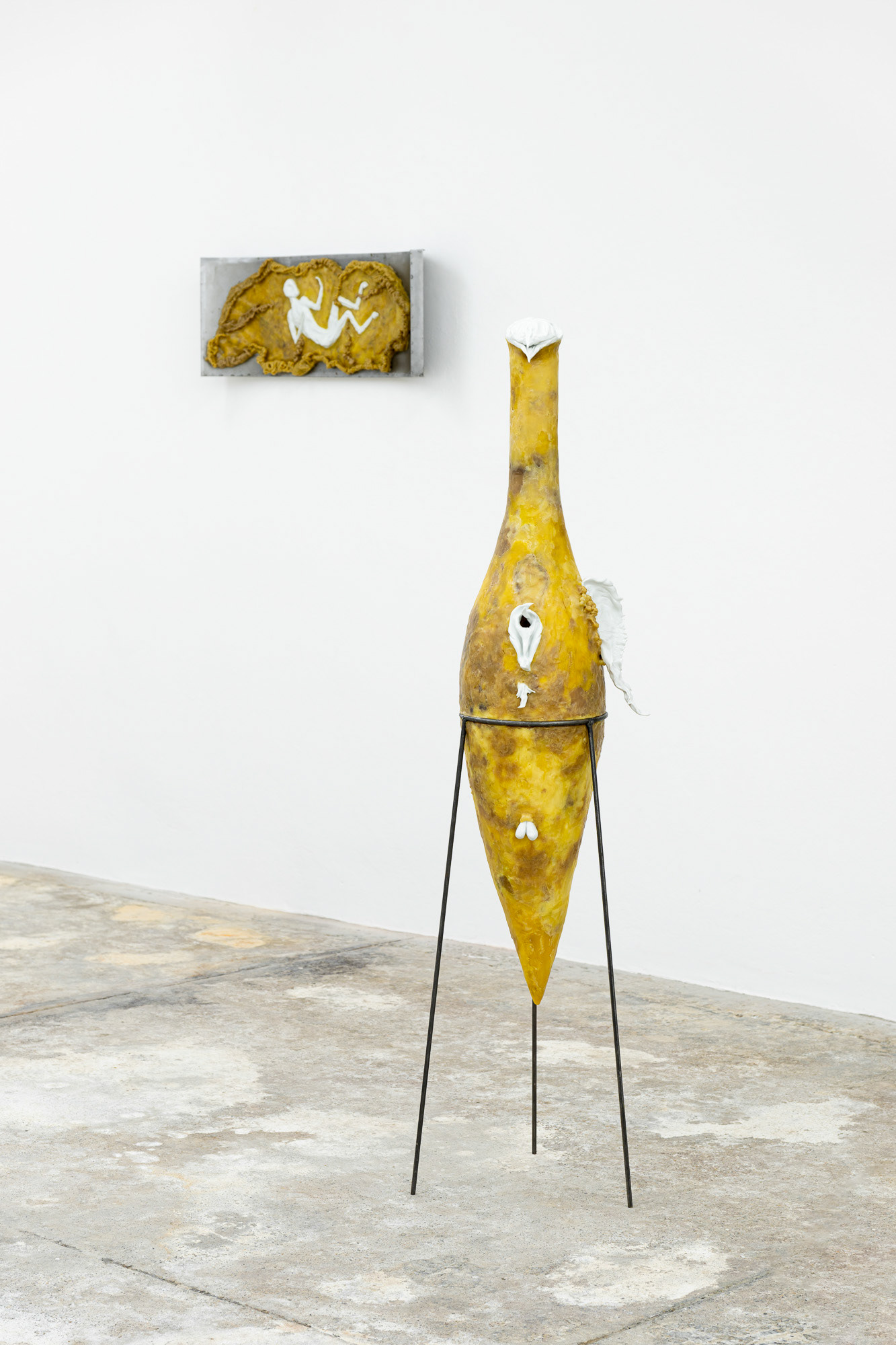 Gideon Horváth (b. 1990, lives in Budapest) is a Hungarian interdisciplinary artist who primarily creates sculptures and spatial installations. He works with beeswax, porcelain, and iron, emphasizing both their material qualities and symbolic dimensions. For Horváth, wax— secreted by the glands of bees—is a personal and sensual substance that forges an intimate bond between himself and nature. Through his works, he explores the relationship between corporeality, the stigmatization of minorities, and shame, drawing on myths and queer theory. In the selected works, he fragmentarily alludes to the figures of Faunus and Mercury—direct references to classical mythology, which he updates with his own sensitivity and personal experience. A free-standing object resembling an ancient amphora depicts a hybrid bird-human figure, whose intricate porcelain details communicates beauty, repulsion, vulnerability, and vengeance. The central installation, Overripe Fruits, has been inspired by childhood memories of a garden full of apricots, which were perfect only for a fleeting moment. The overripe fruit not only symbolizes the personal experience of a guilty pleasure, but also communicates a broader context of unrecognized and suppressed love.