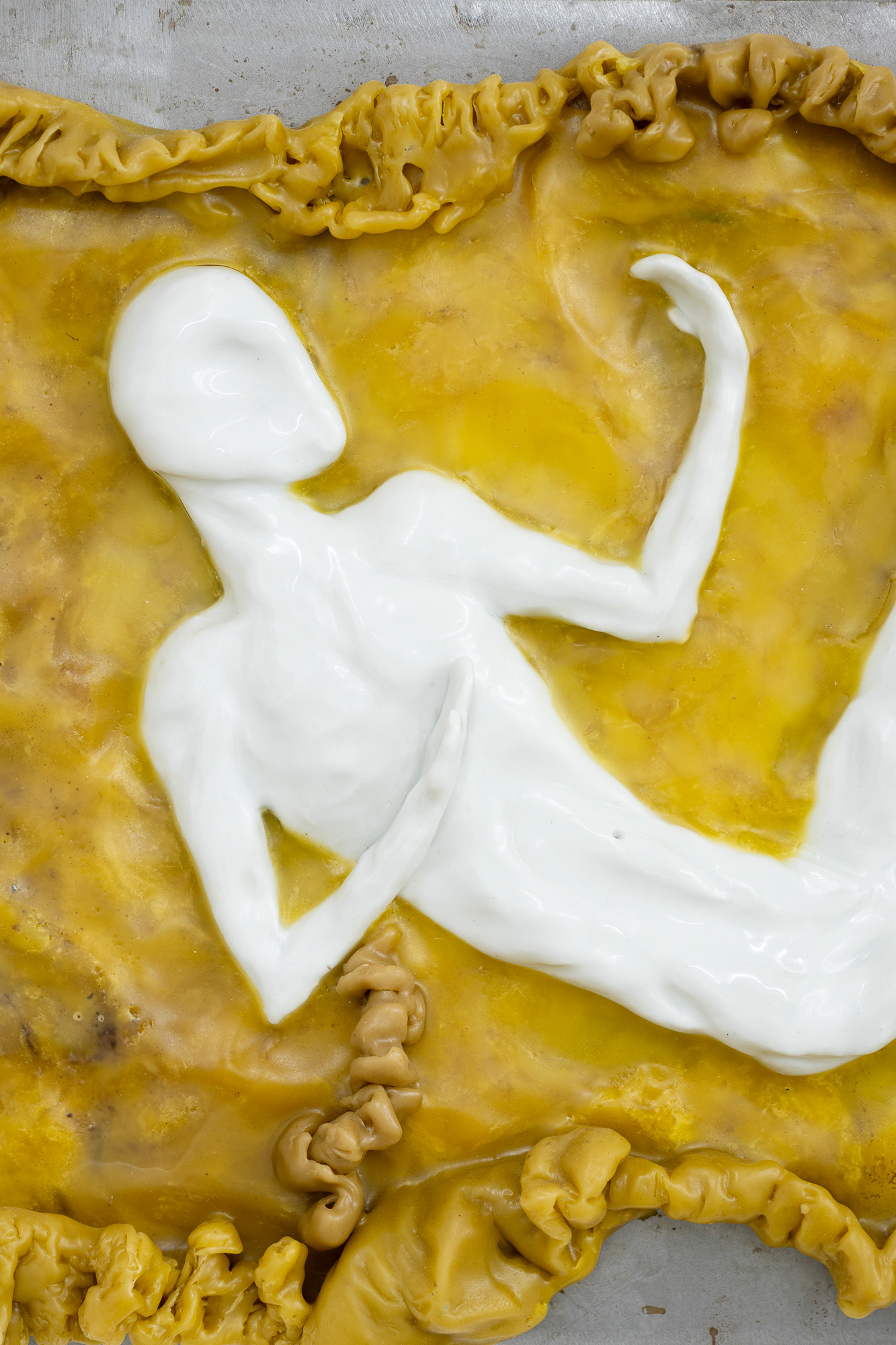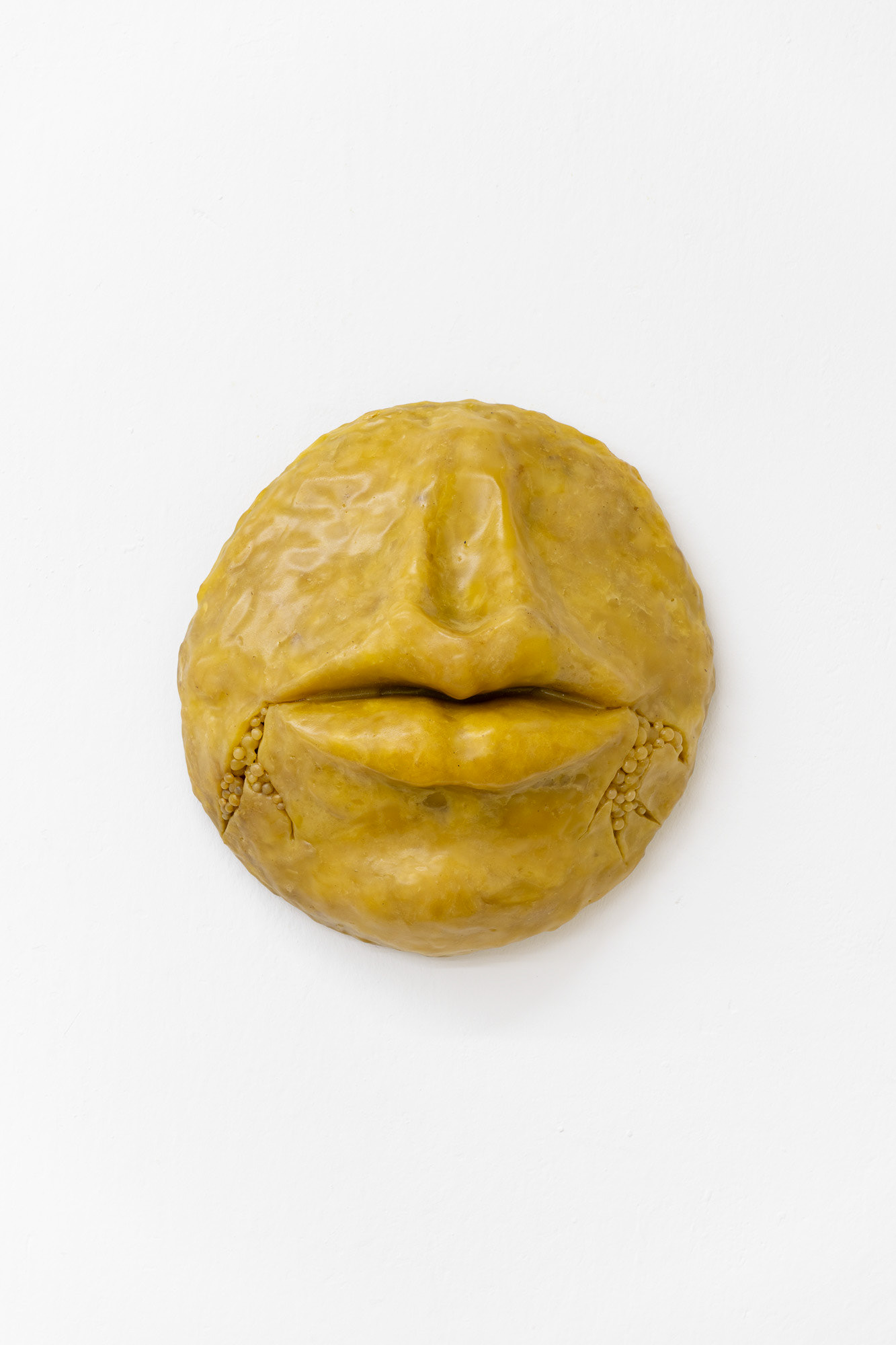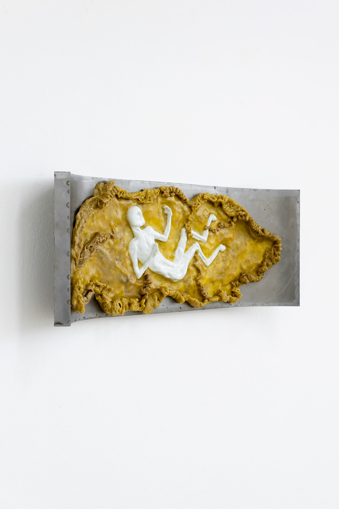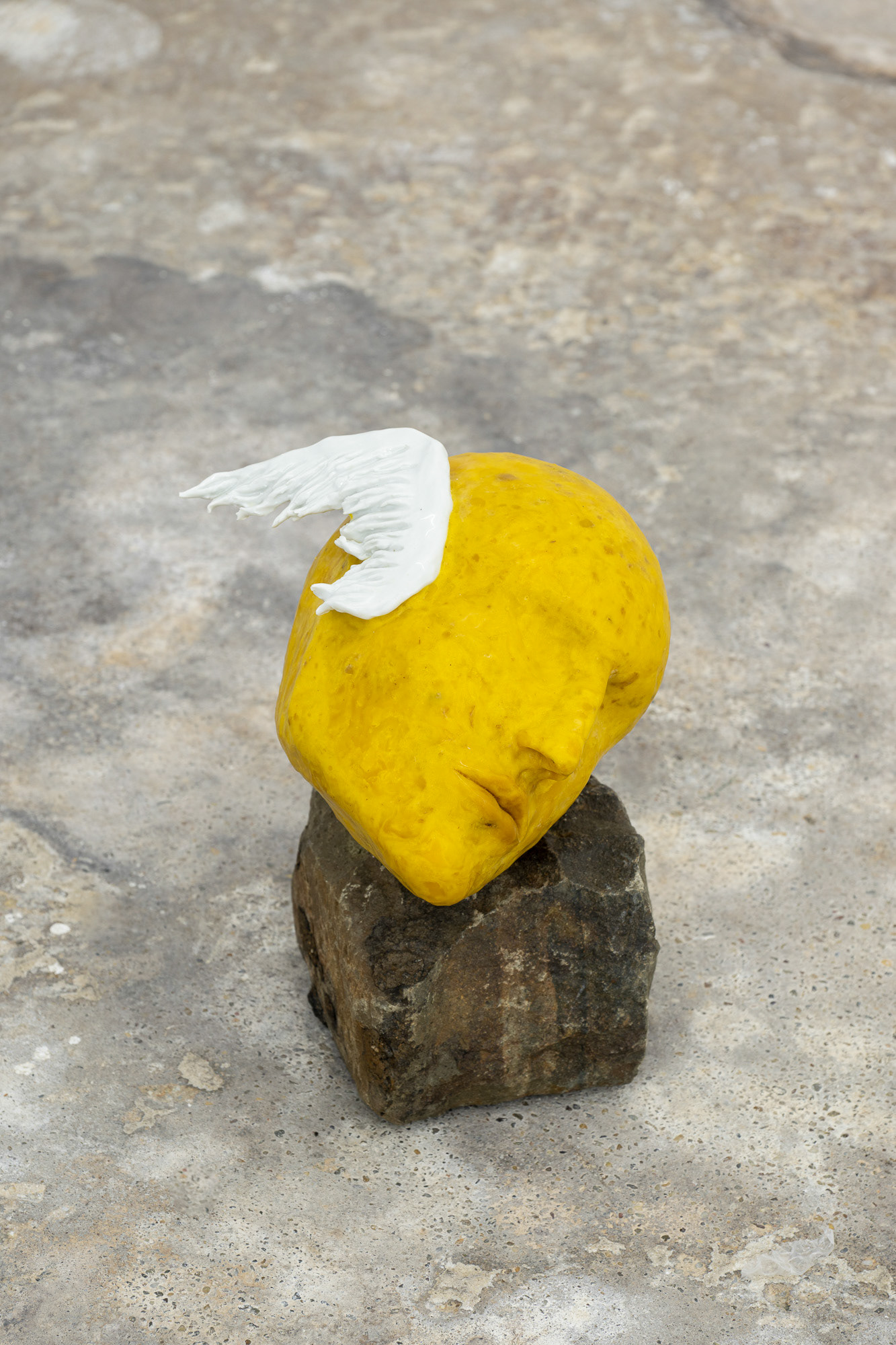 Gideon Horváth (b. 1990, lives in Budapest) is a Hungarian interdisciplinary artist who primarily creates sculptures and spatial installations. He works with beeswax, porcelain, and iron, emphasizing both their material qualities and symbolic dimensions. For Horváth, wax— secreted by the glands of bees—is a personal and sensual substance that forges an intimate bond between himself and nature. Through his works, he explores the relationship between corporeality, the stigmatization of minorities, and shame, drawing on myths and queer theory. In the selected works, he fragmentarily alludes to the figures of Faunus and Mercury—direct references to classical mythology, which he updates with his own sensitivity and personal experience. A free-standing object resembling an ancient amphora depicts a hybrid bird-human figure, whose intricate porcelain details communicates beauty, repulsion, vulnerability, and vengeance. The central installation, Overripe Fruits, has been inspired by childhood memories of a garden full of apricots, which were perfect only for a fleeting moment. The overripe fruit not only symbolizes the personal experience of a guilty pleasure, but also communicates a broader context of unrecognized and suppressed love.