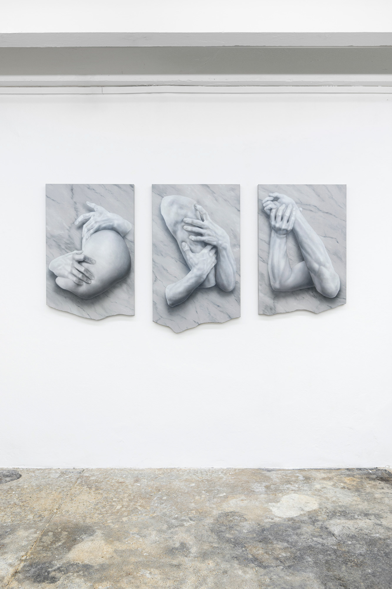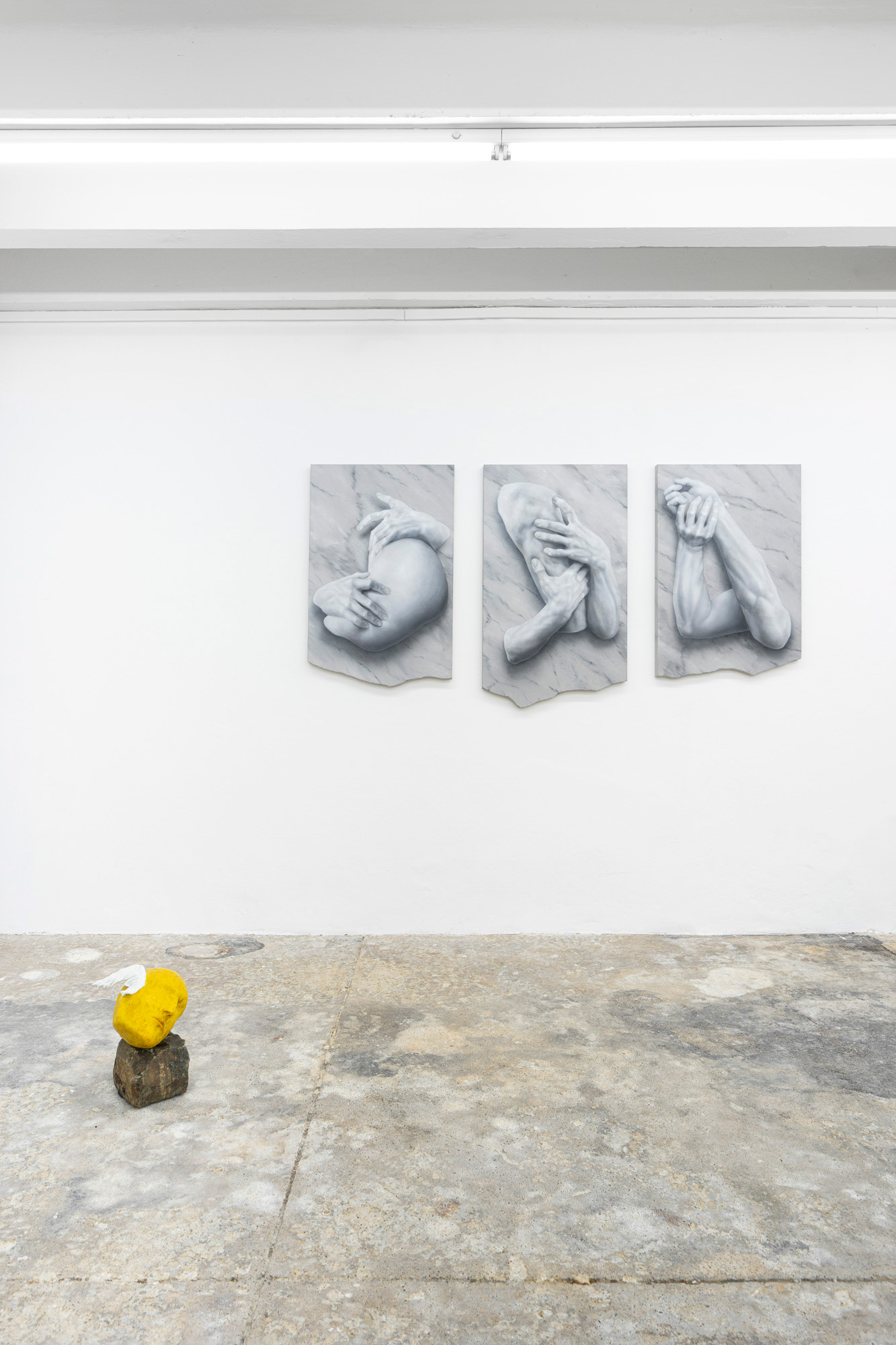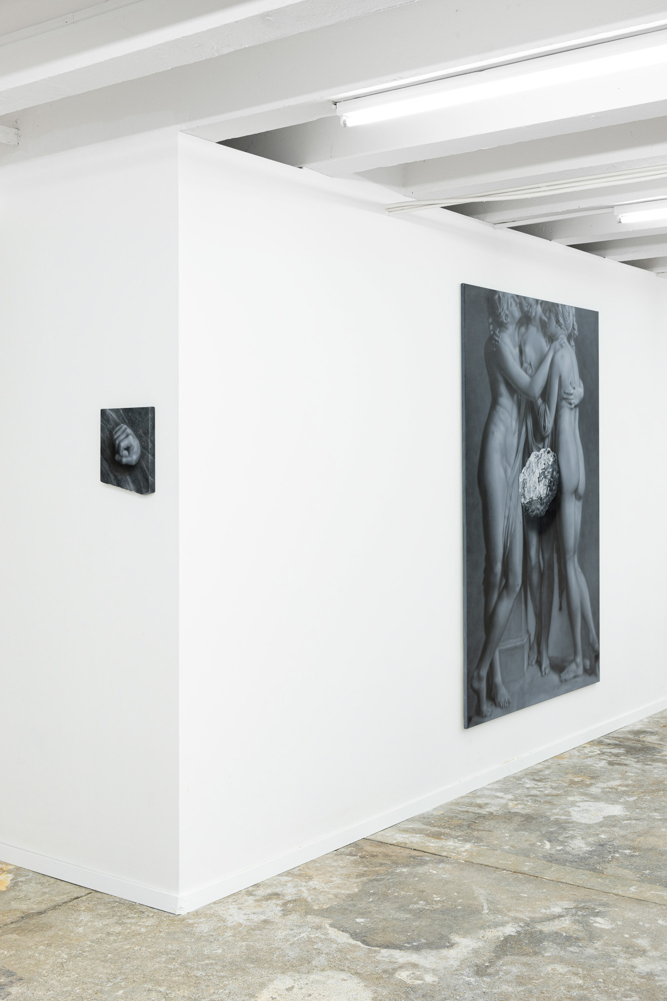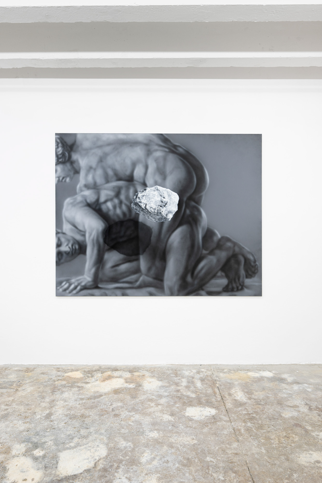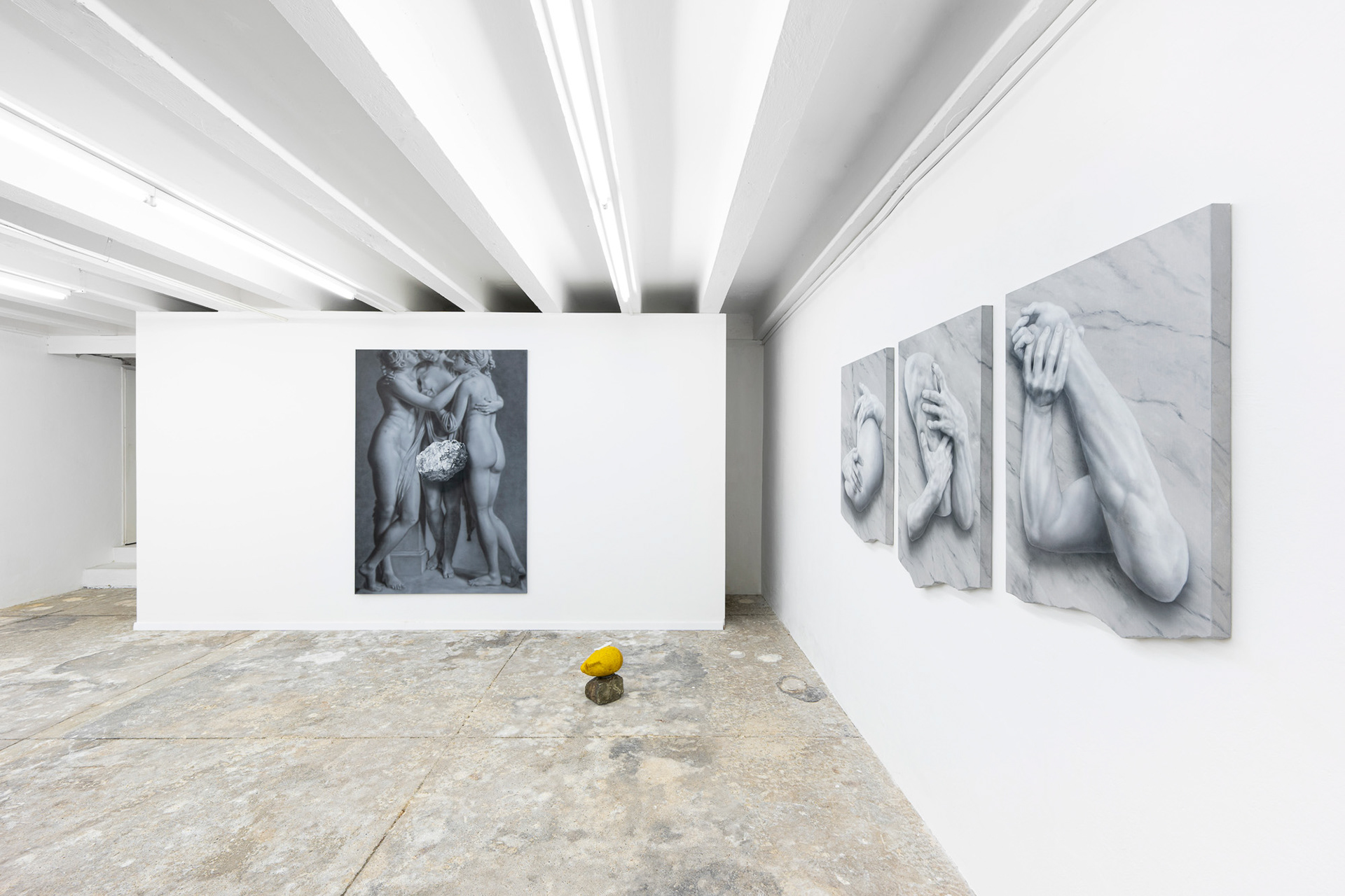 Adam Šakový (b. 1987, lives in Bratislava) is a Slovak visual artists who focuses on figurative painting, updated through post-conceptual thinking and subtle alterations and disruptions to images. His works explore the relationship between tradition and contemporaneity, using symbols and metaphors that he transforms with a distinctive eye for detail and a realist auteur language. At the exhibition, he presents a selection from his earlier series Stones, complemented by a new triptych. The featured figural compositions quote iconic sculptural works, which Šakový transforms through strategic selection, composition, and painterly interpretation. Although immobile and material, the sculptures and figures in his paintings are depicted as living organisms. We observe their relational connections—whether whole figures or body fragments, coming alive in tense situations, passionate conflicts, or sensual poses. Uprooted from their historical context, they serve as commentaries on human interactions. The artist’s key strategy is the visual imitation of materials and physical phenomena. Marble slabs or levitating objects appear with realistic shadows that alter their nature and spatial properties. The stones and their raw painterly textures emerge as the central motive, existing functionally on the brink between object and illusion.