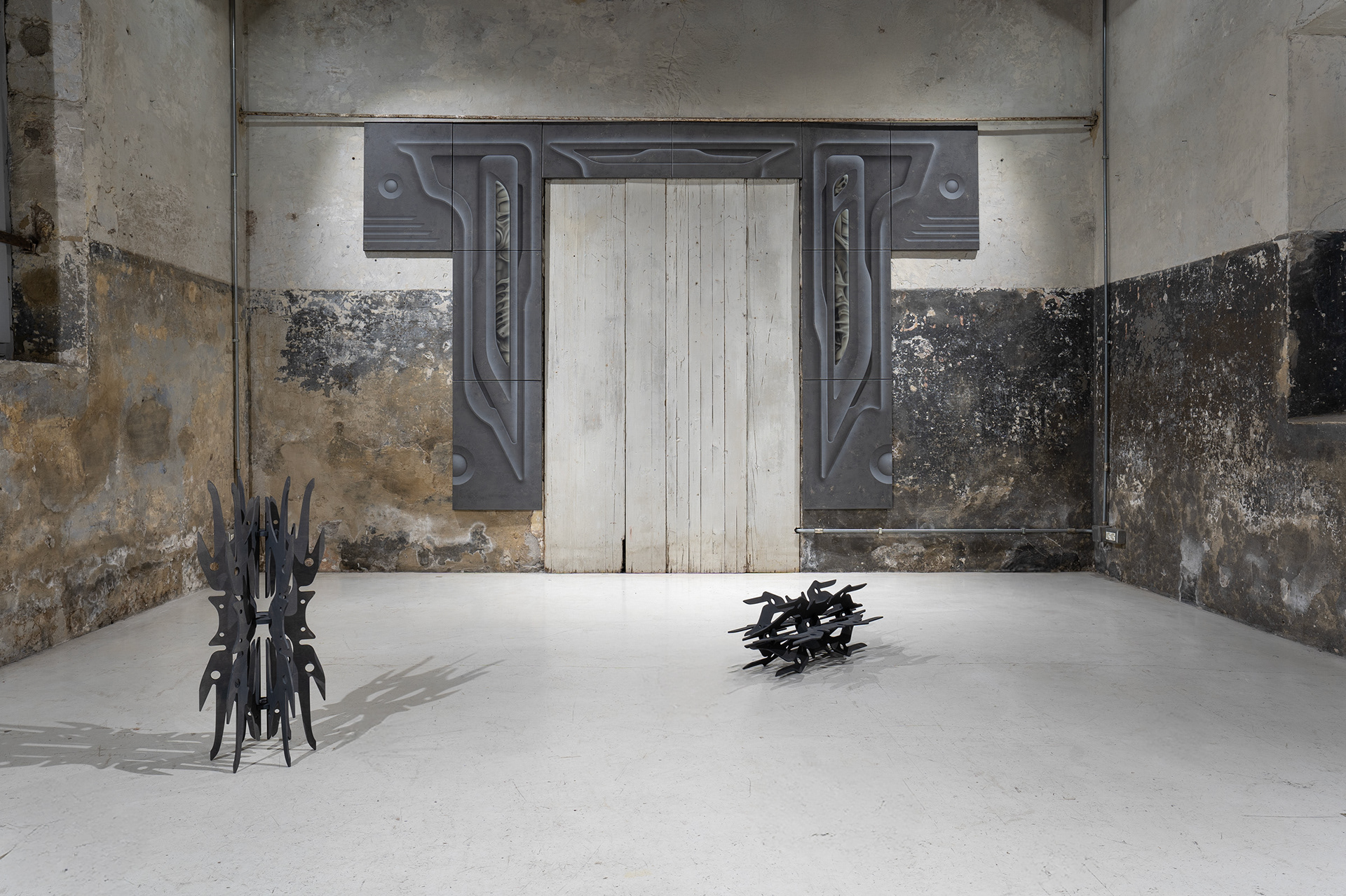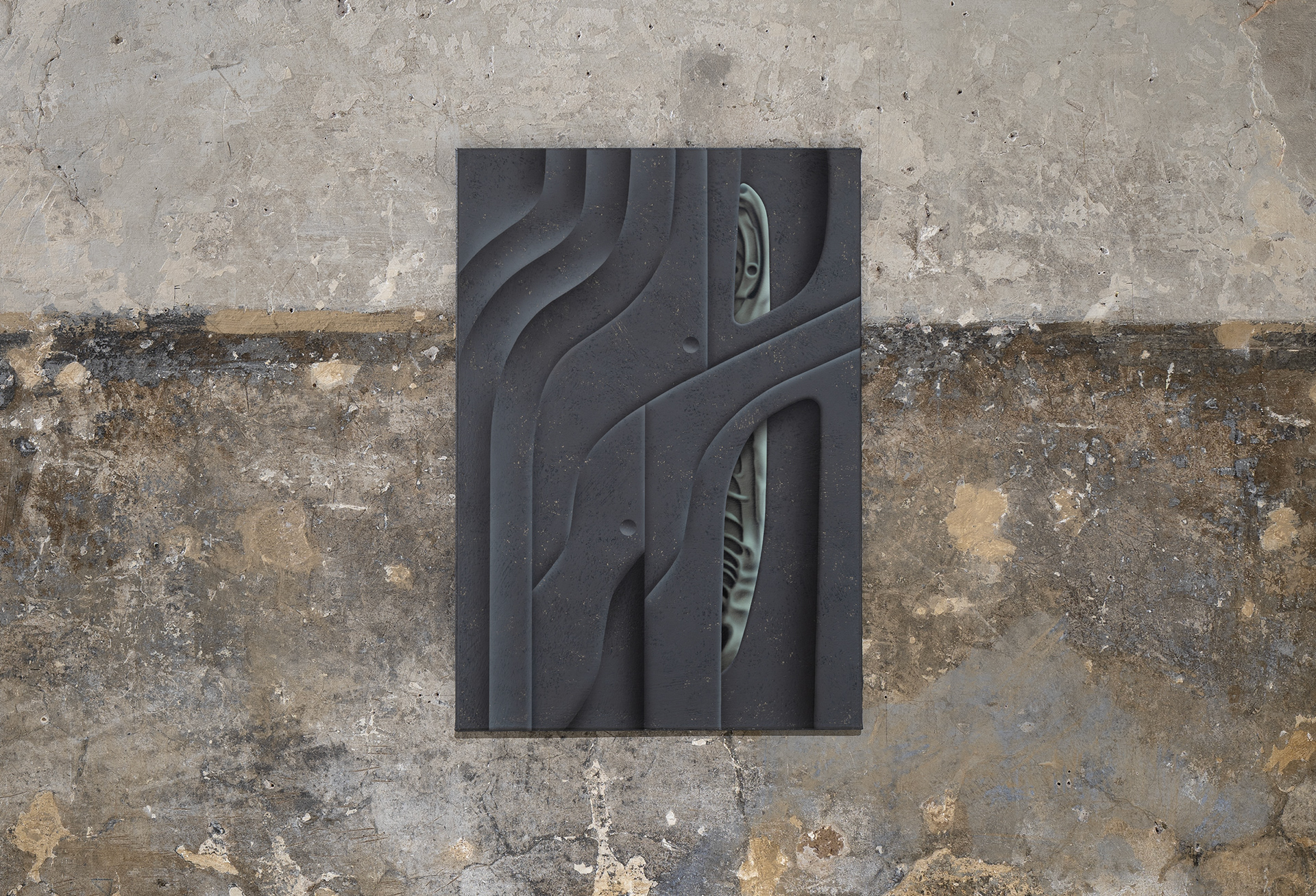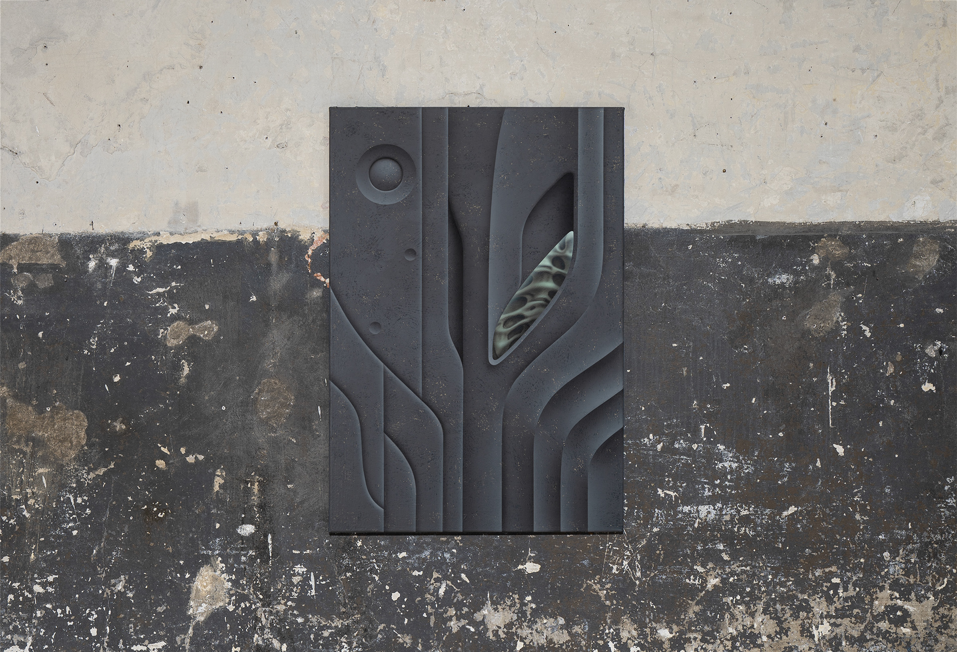 The unsettling glimpses into the portal’s core reveal hints of life, which heighten tension and offer space for imagination. Just as in his remaining objects and paintings, the artist explores the relationship between body and technology. Here, too, it is unclear whether we are observing the remnants of an unknown civilization, fragments of future machines, or ritual objects beyond our current experience.