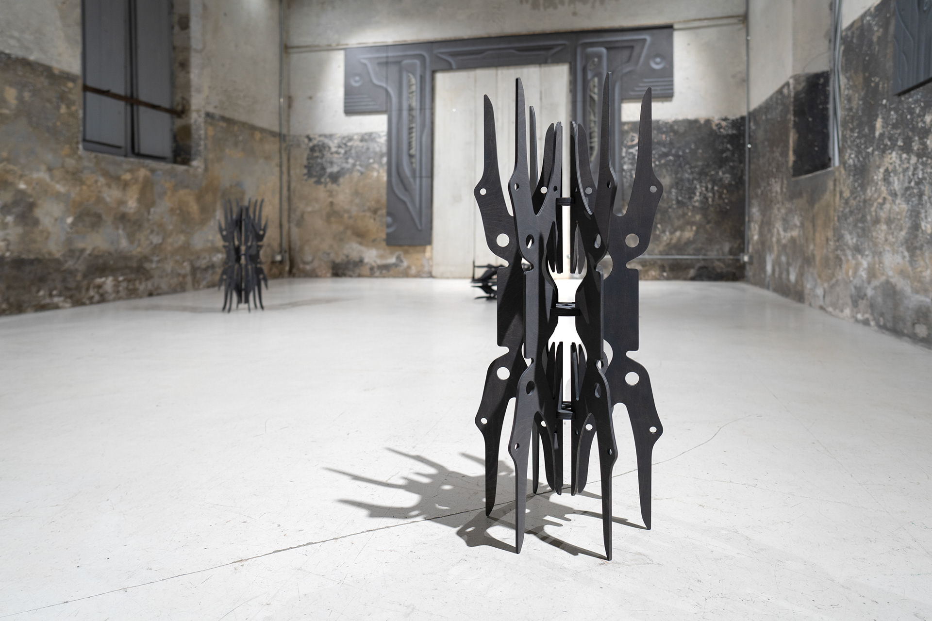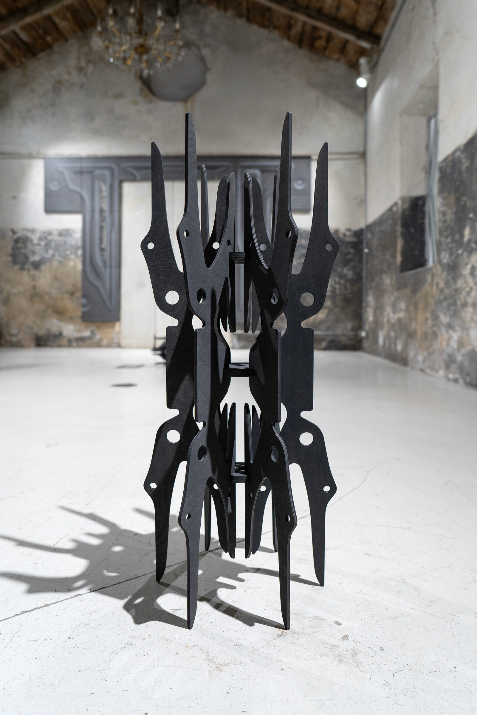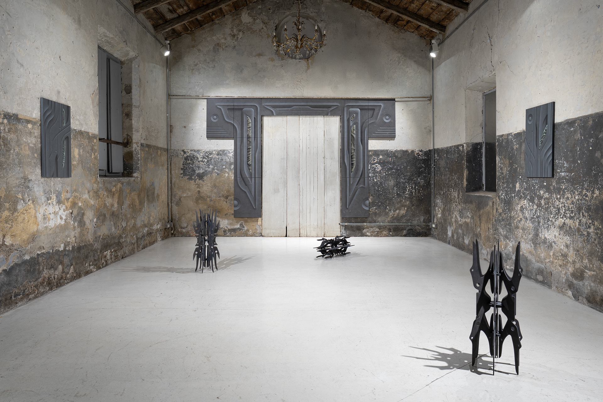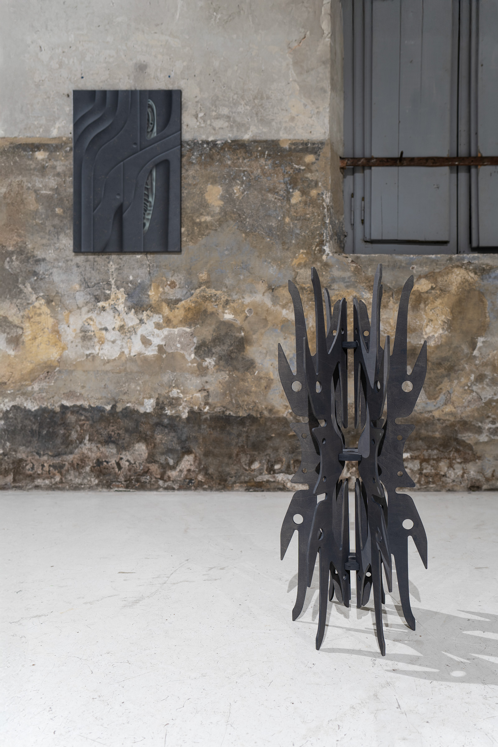 The unsettling glimpses into the portal’s core reveal hints of life, which heighten tension and offer space for imagination. Just as in his remaining objects and paintings, the artist explores the relationship between body and technology. Here, too, it is unclear whether we are observing the remnants of an unknown civilization, fragments of future machines, or ritual objects beyond our current experience.