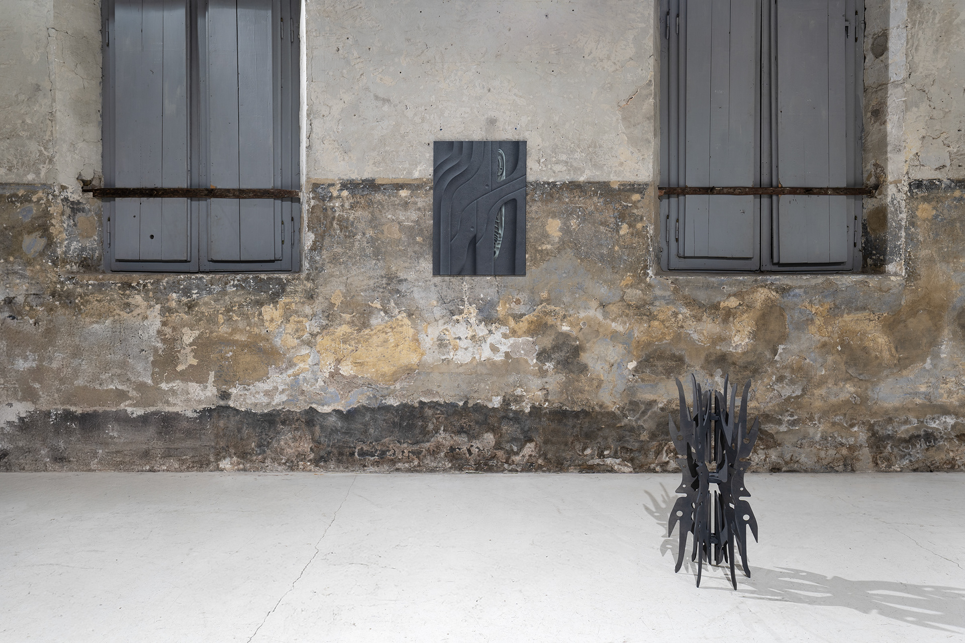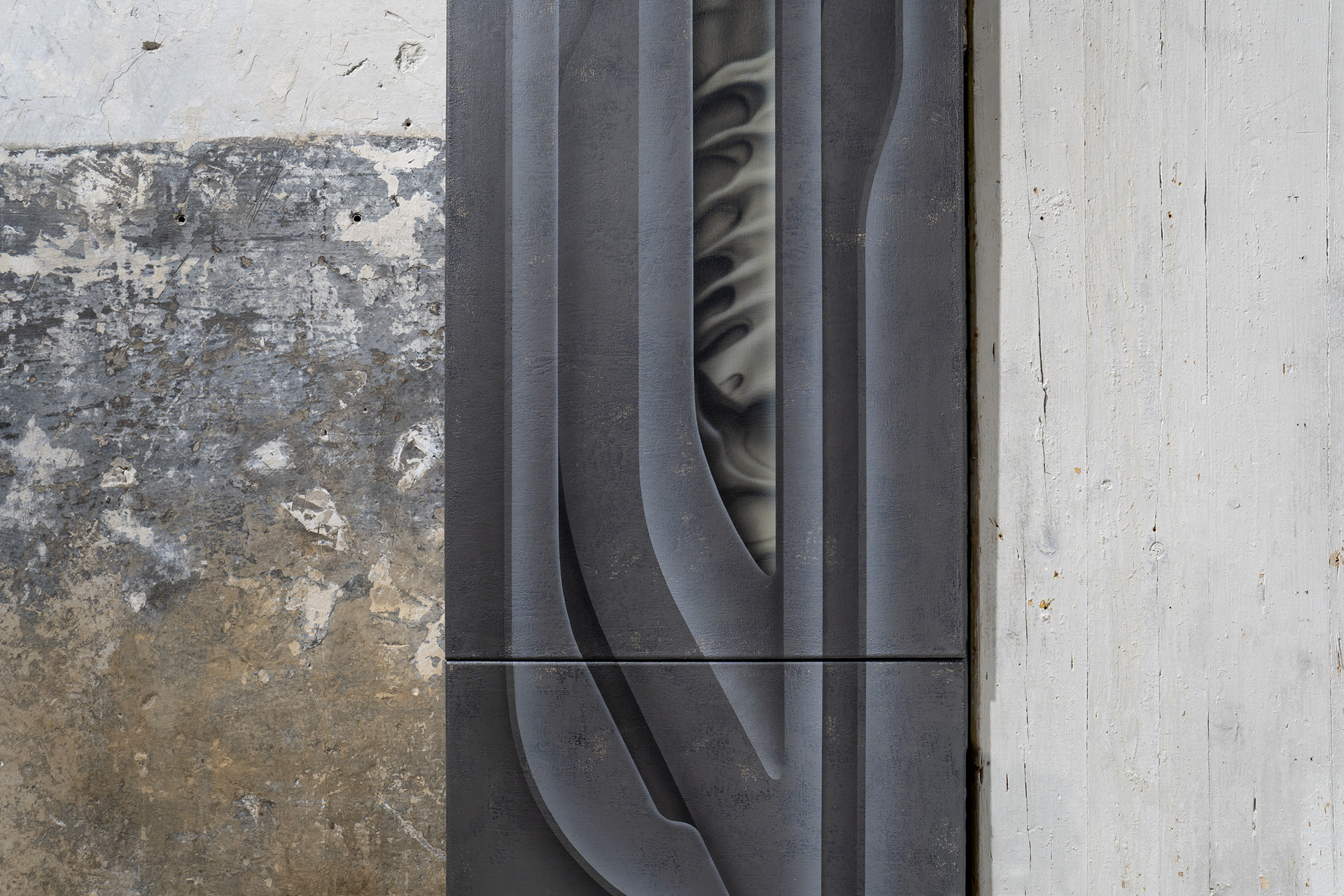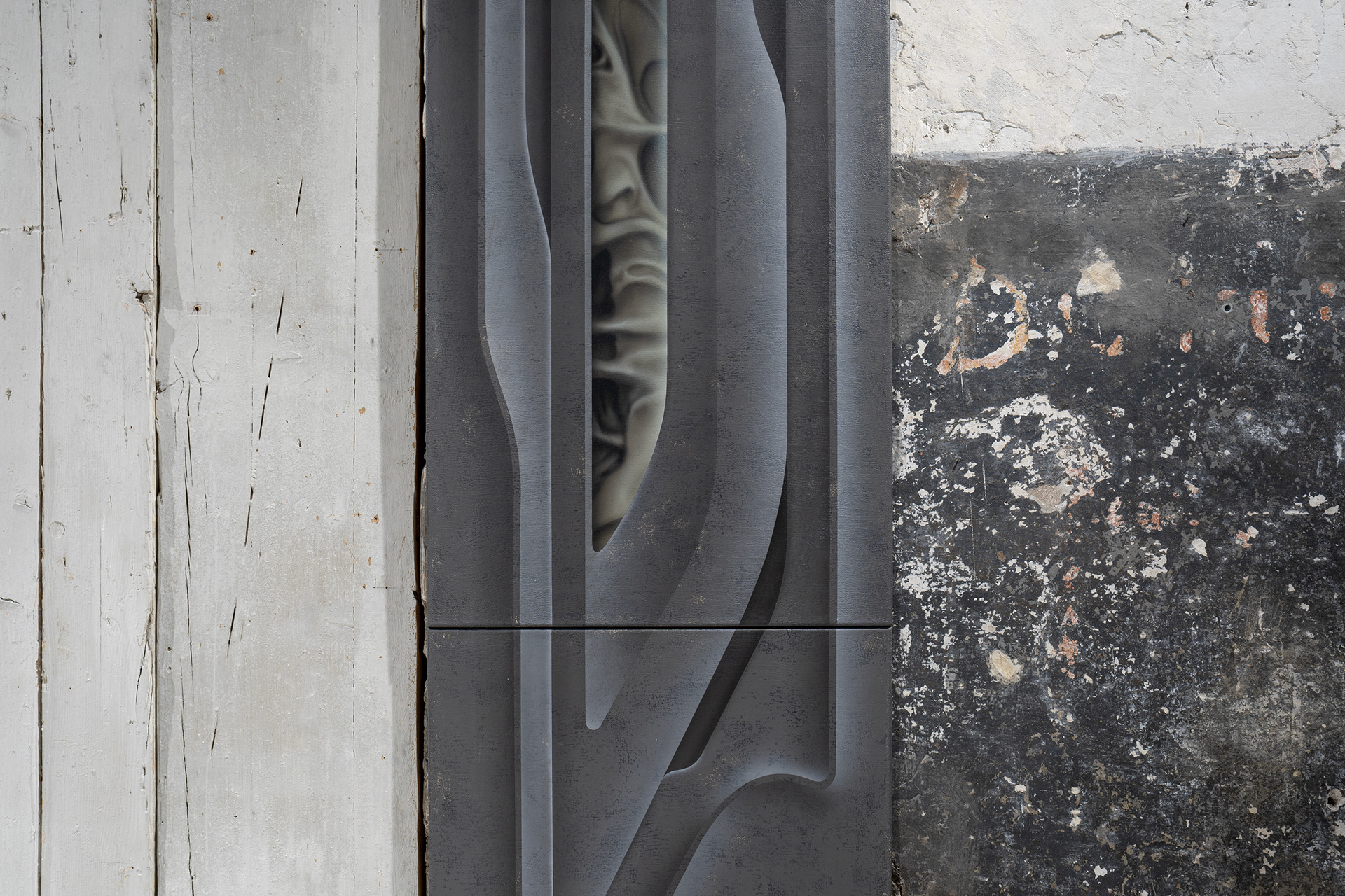 The space breathes history, saturated with moisture, time, and traces of the past, inviting us to step into another dimension. A delicate fissure between worlds opens before us — a fragment of an unknown portal. We find ourselves at the edge between reality and fiction, between surface and depth, between what is alive and what merely resembles life. The thin line symbolizes what lies ahead and what lies behind, what has been and what is yet to come. It is a place where forms transform, materials lose their identity, and physical experience dissolves into memory and the digital flow of data. Time behaves elastically; here, the past and the future speak through the lens of the present.