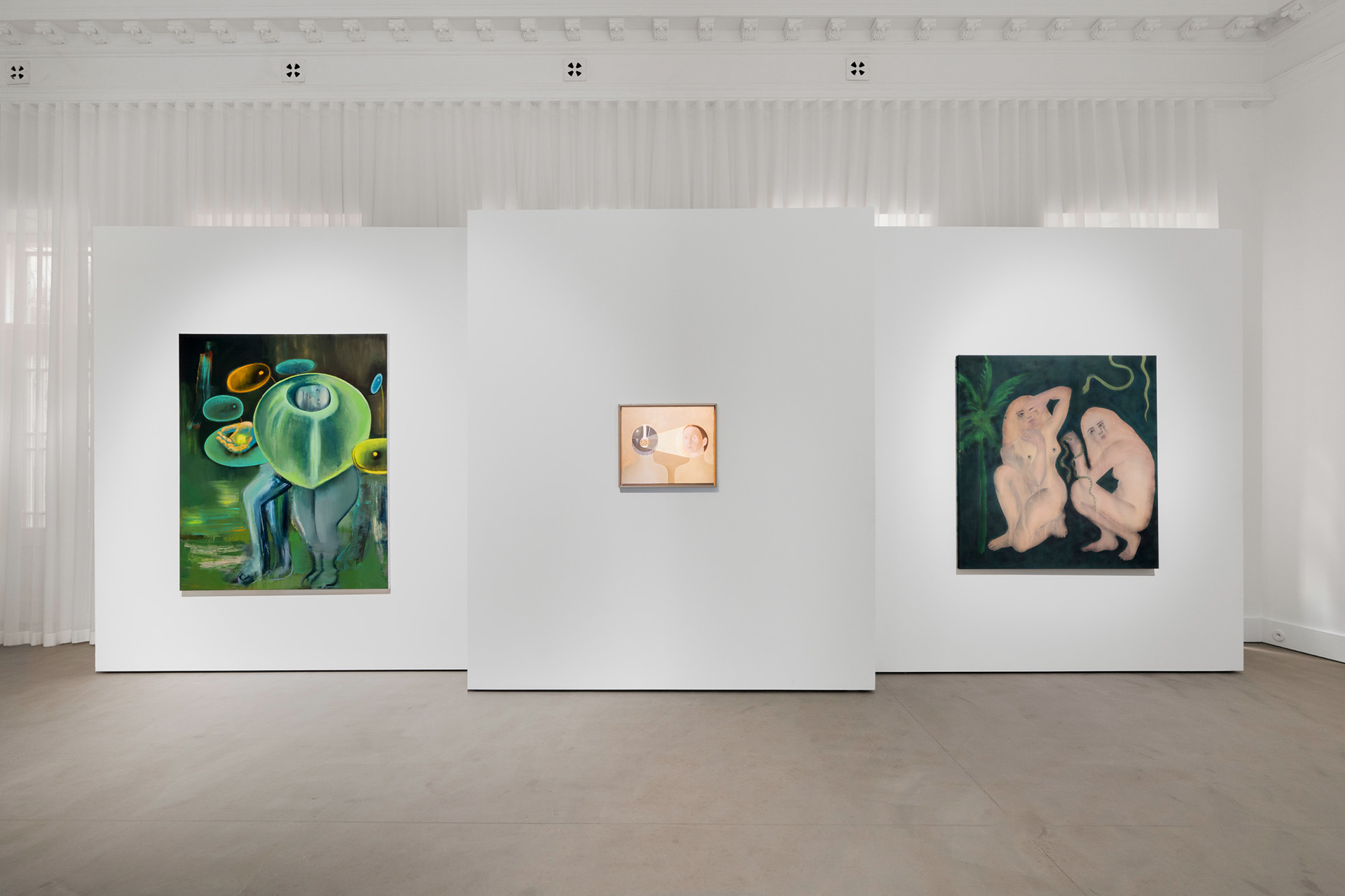 Although each artist works in a different city, social context, and has different daily experiences, it is their communication through painting that unites them, bringing intimate and almost diary-like records. Laura Limbourg and Silvia Krivošíková communicate through stylized self-portraits, while Pavla Malinová cleverly deconstructs and conceals her identity until it is unrecognizable. Whether it involves romantic relationships or a plunge into the depths of their own inner selves, they reveal fragments of their private lives, which they obscure with mysterious hints and symbols.